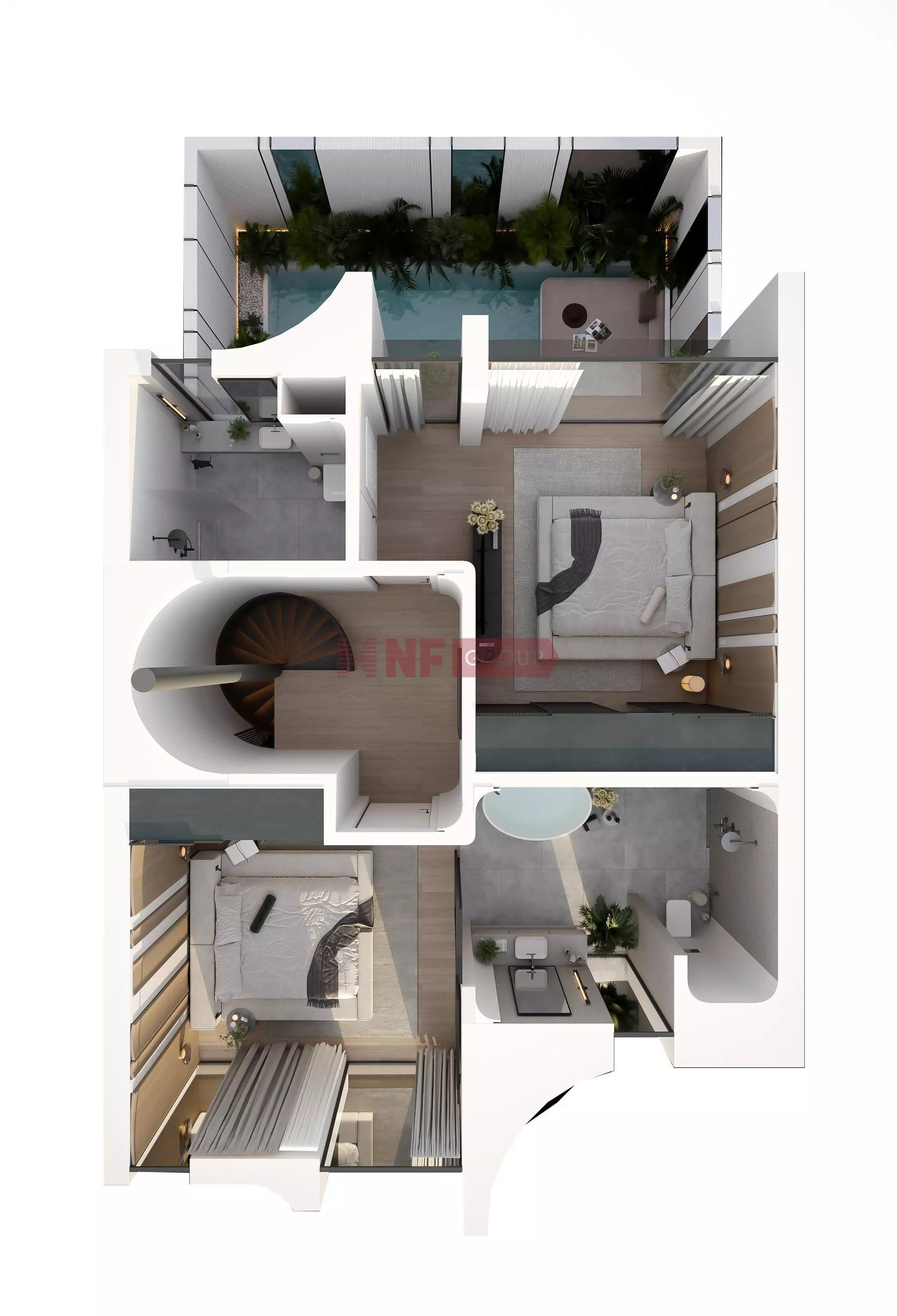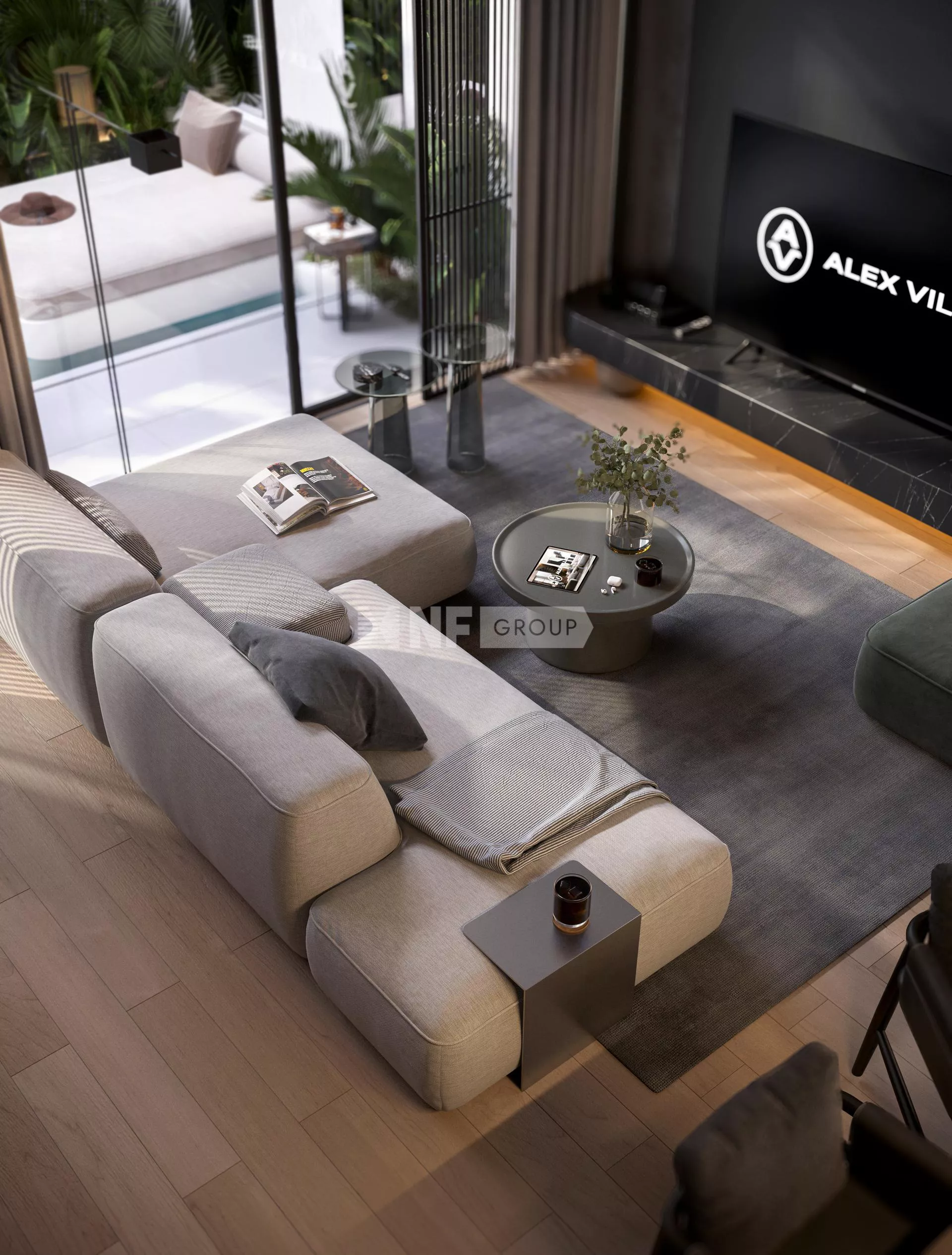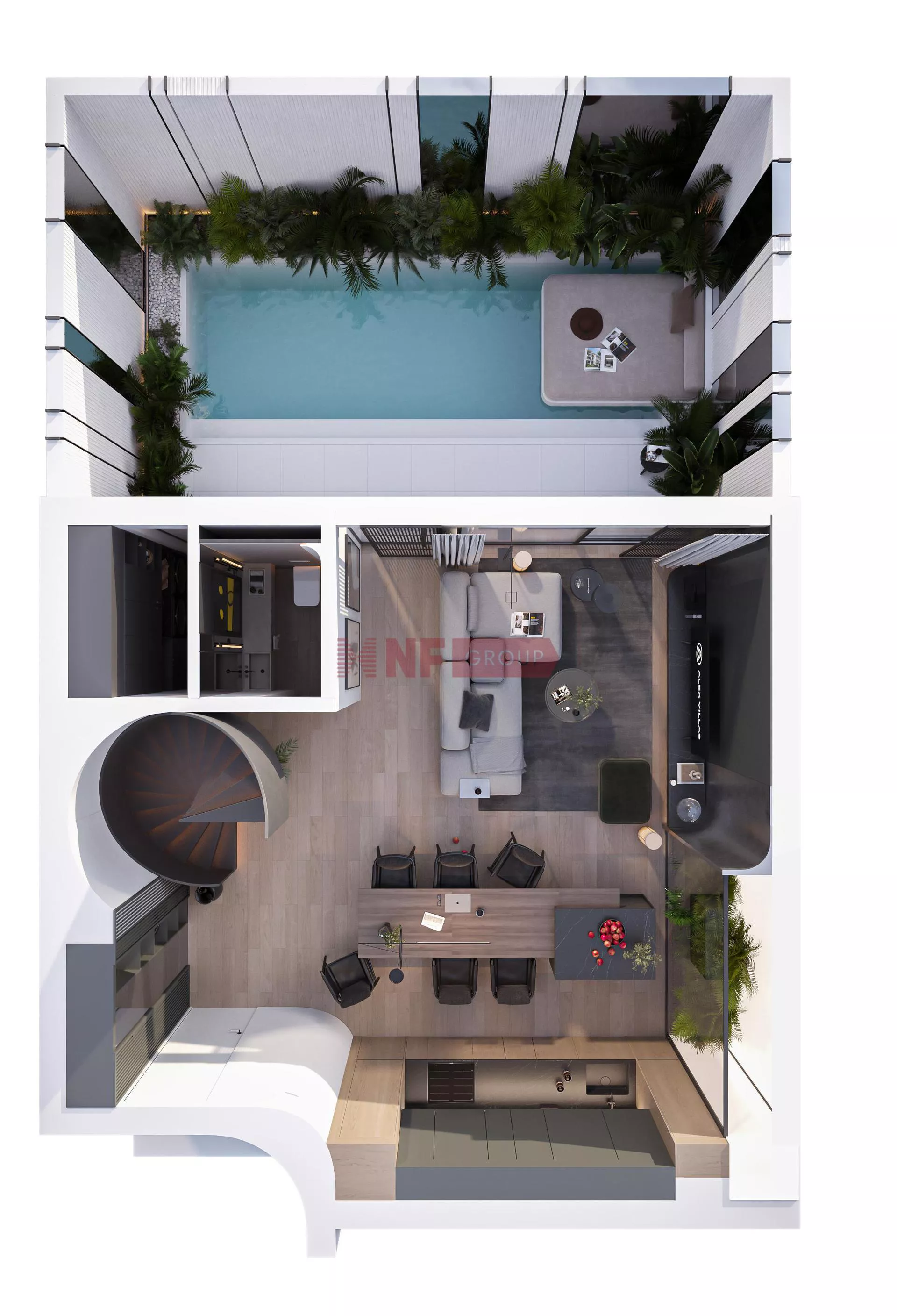 3 Bedroom villa with roof terrace is located in Changgu. There are 14 lots in total. 1st floor: private pool, living room with games console, kitchen and dining area, guest bathroom, storage room. 2nd floor: 2 bedrooms with large beds, 2 bathrooms, storage space. Roof terrace: bedroom with large bed, bathroom, storage space, sauna and mini-pool, relaxation area.
