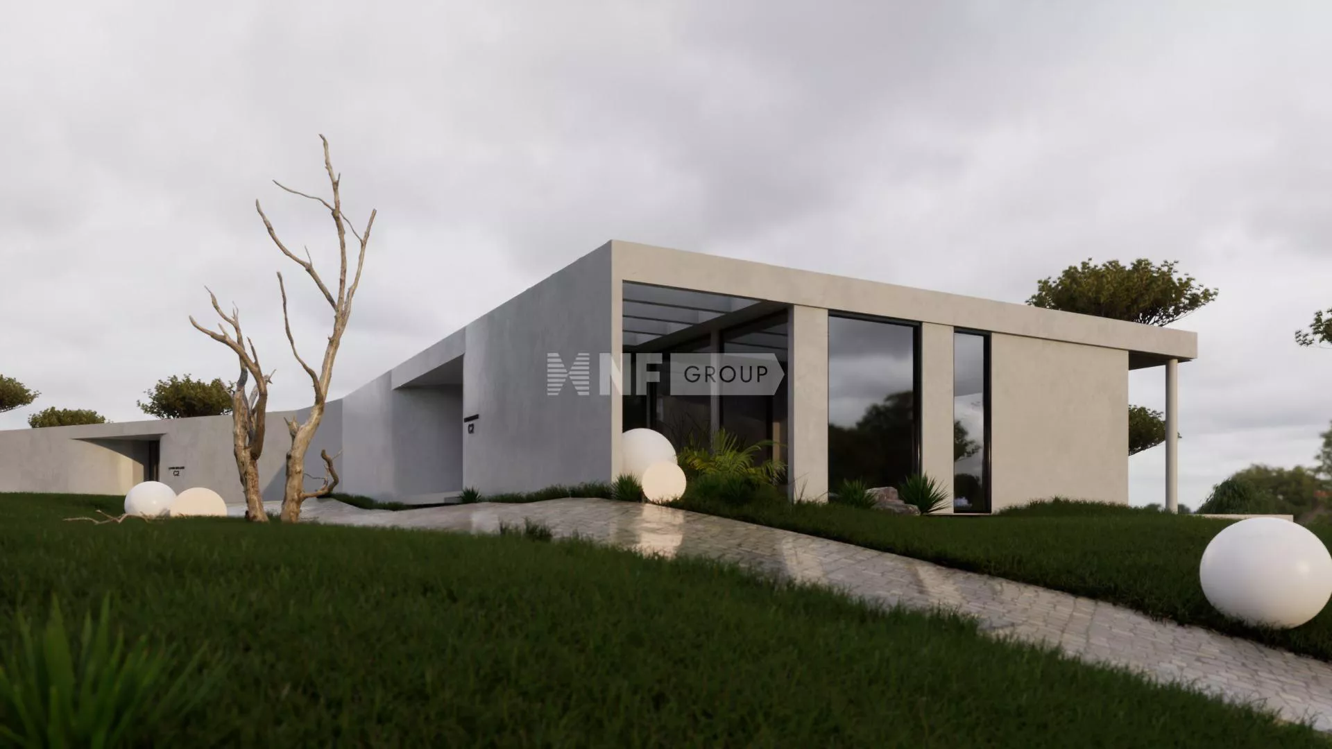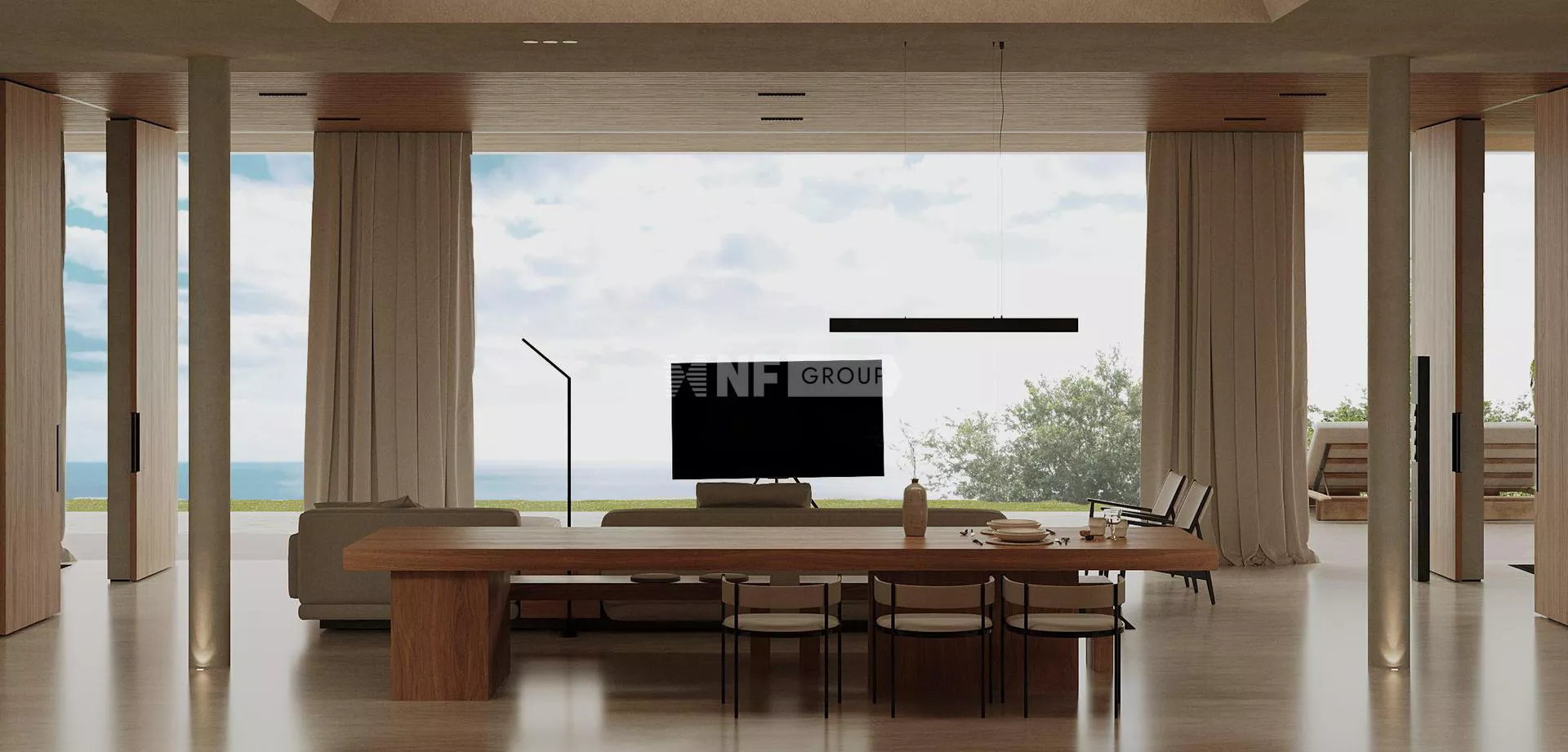 The design features large windows, sliding glass doors and expansive terraces with ocean views. Flat roofs and sleek design lines create a harmonious and streamlined aesthetic.