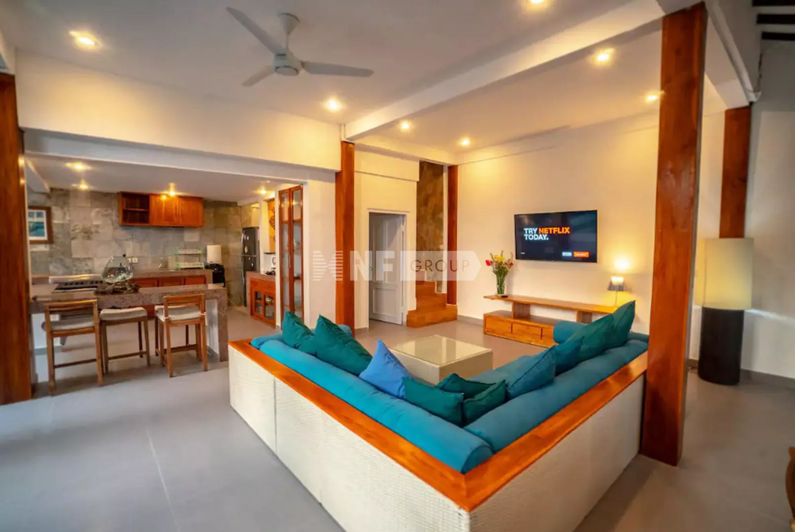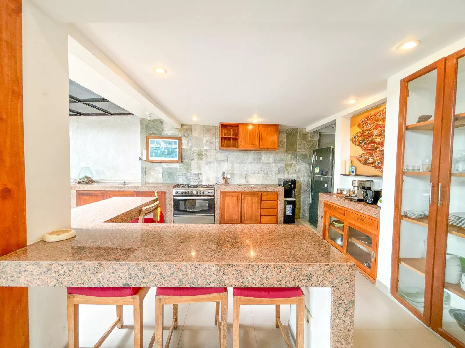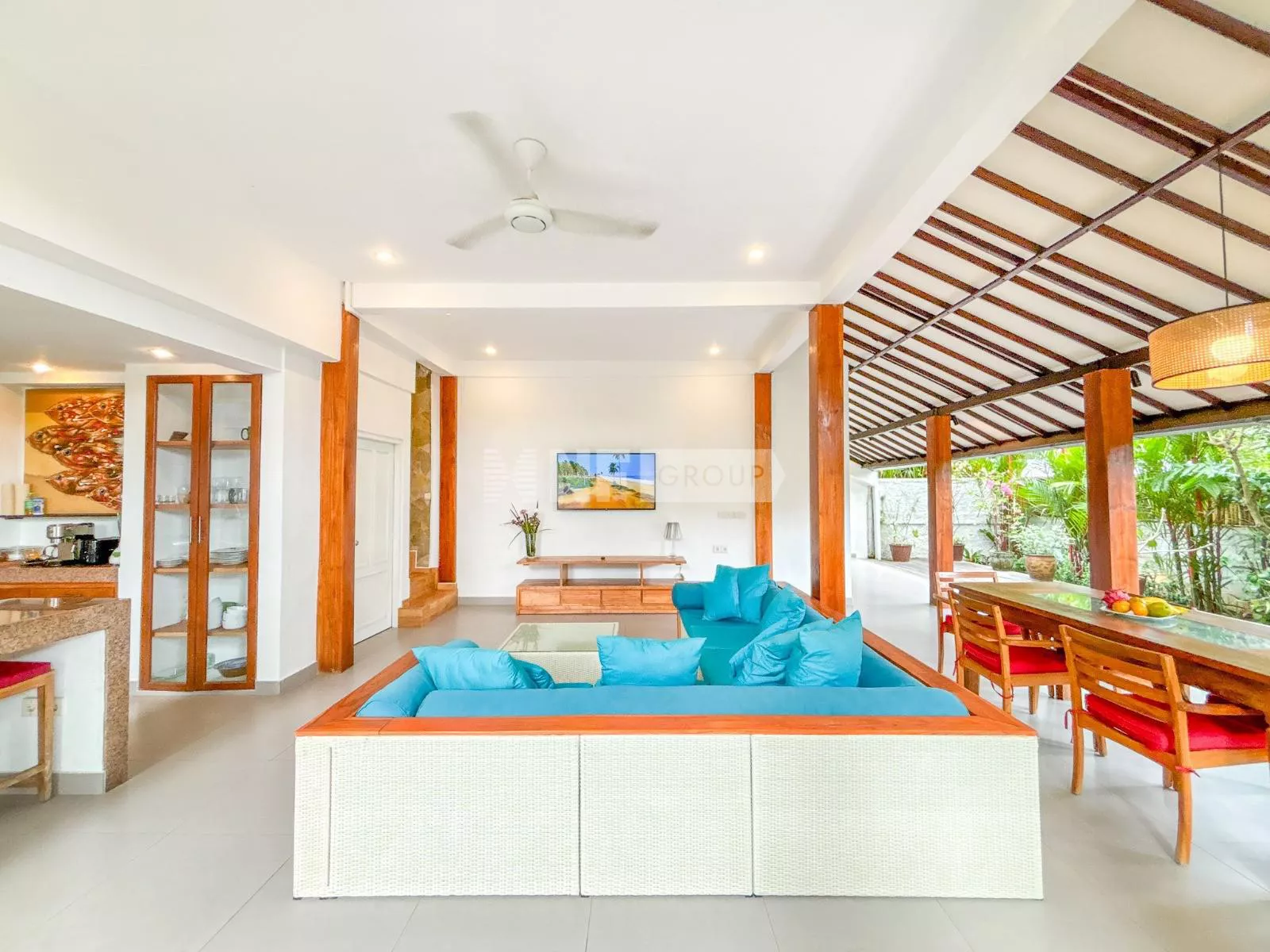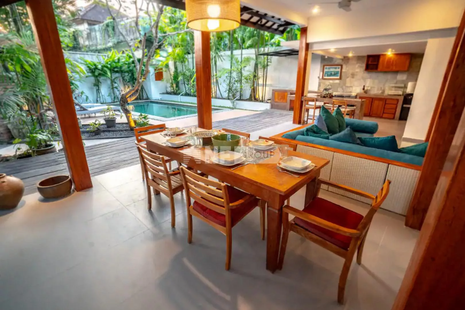 On the ground floor, an inviting open-plan living space captures the essence of Balinese design, surrounded by lush greenery for a cool and tranquil ambiance. A guest bathroom and a fully equipped kitchen—with elegant teak cabinetry, Egyptian red granite countertops, a full-size oven, and a spacious pantry—complete the space.