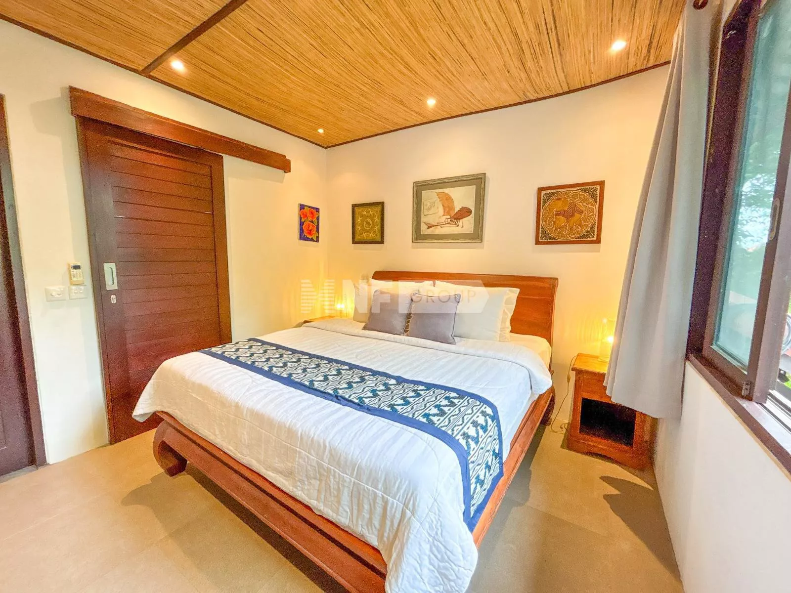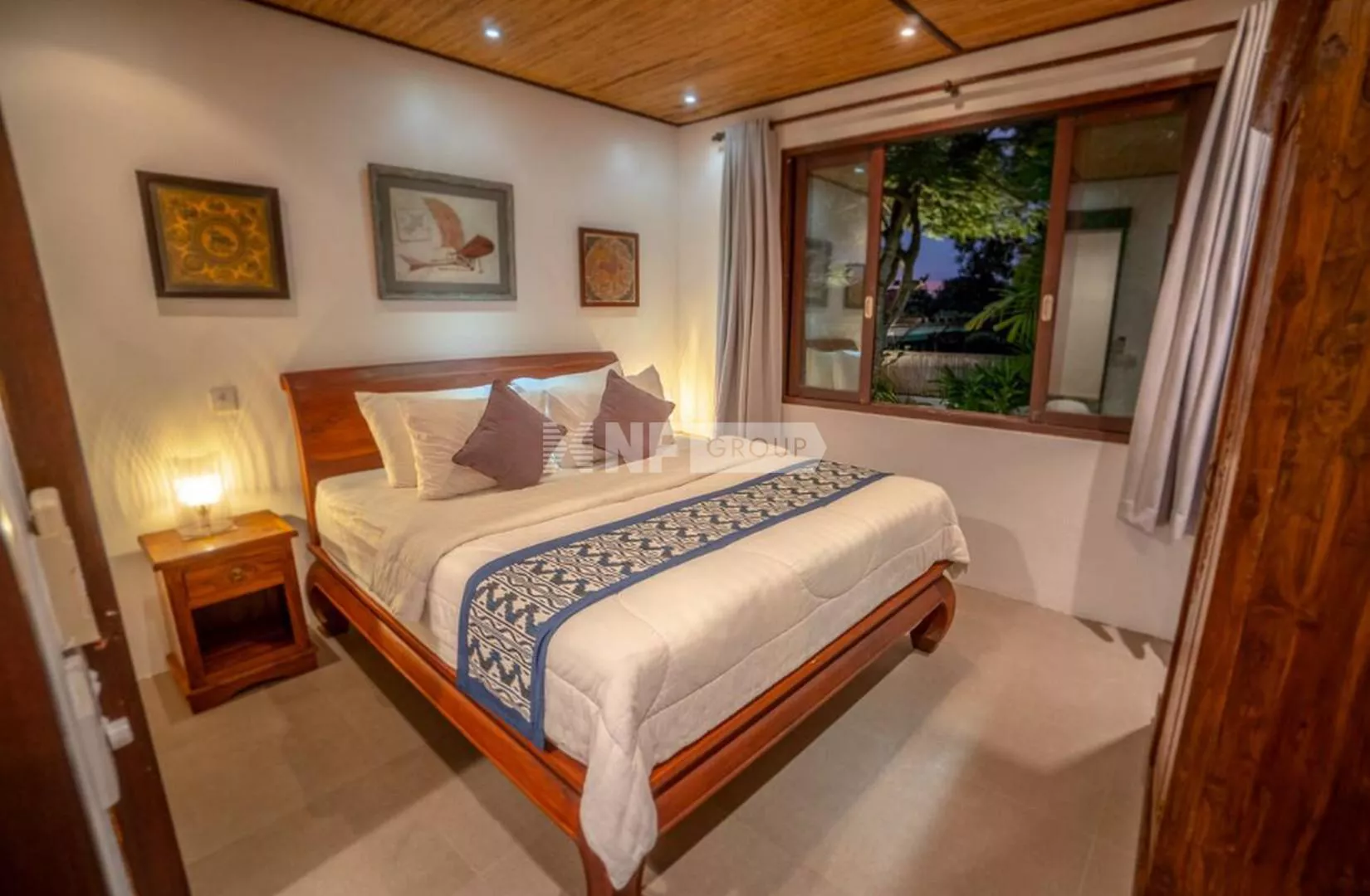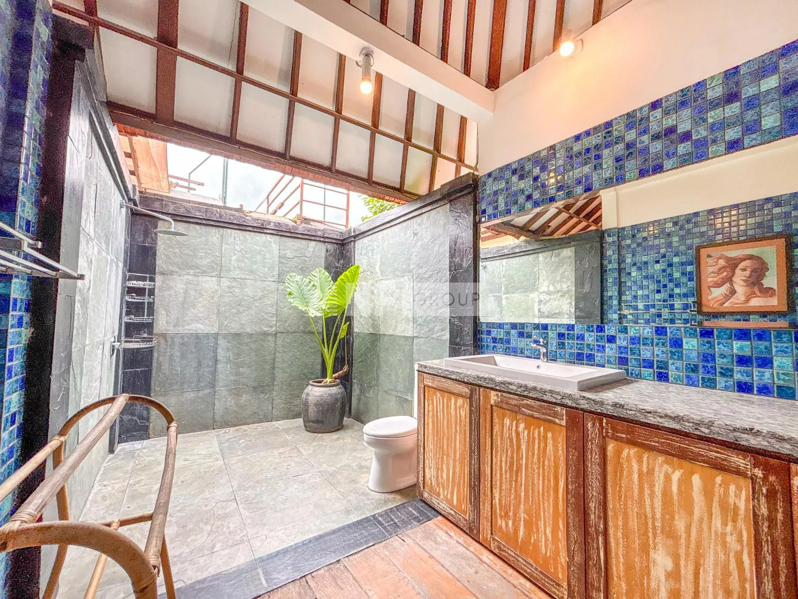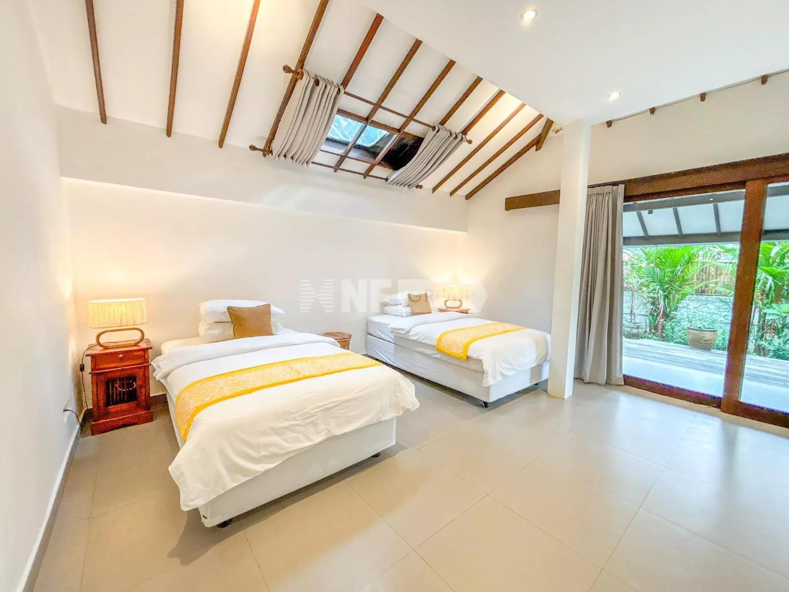 On the ground floor, an inviting open-plan living space captures the essence of Balinese design, surrounded by lush greenery for a cool and tranquil ambiance. A guest bathroom and a fully equipped kitchen—with elegant teak cabinetry, Egyptian red granite countertops, a full-size oven, and a spacious pantry—complete the space.