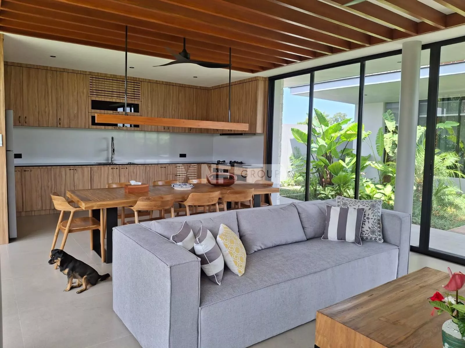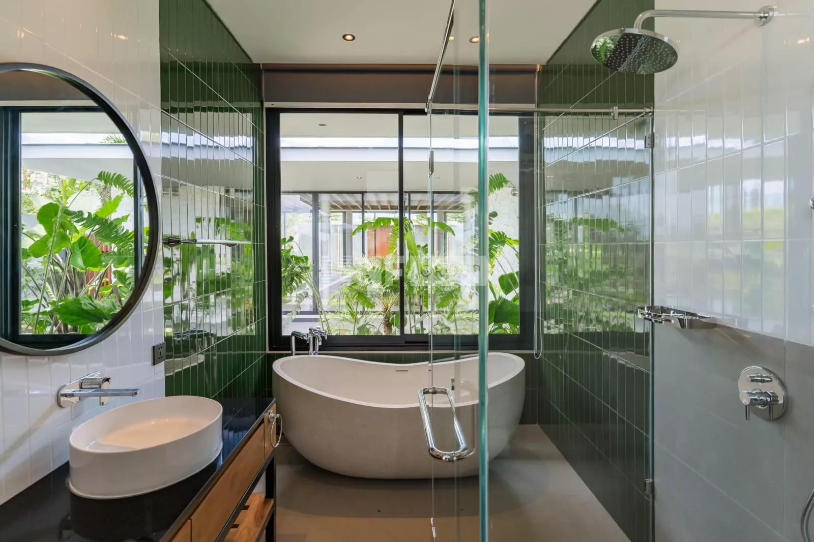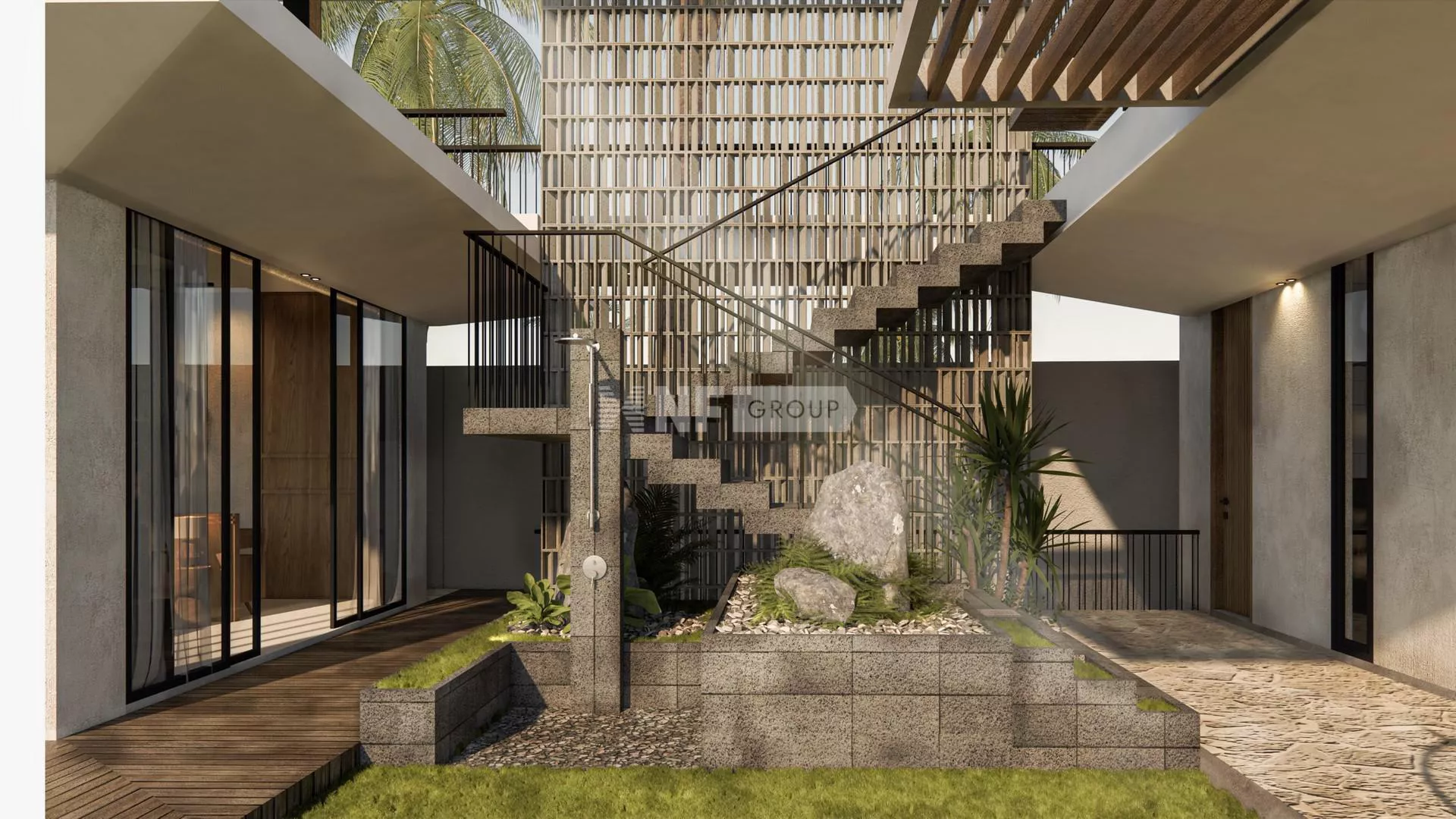 Sitting on 490 sqm of land, the villa is offered on a 32-year lease (until 2057). Designed with contemporary elegance and natural wooden accents, the home features four spacious bedrooms with ensuite bathrooms—two on the ground floor and two upstairs.
