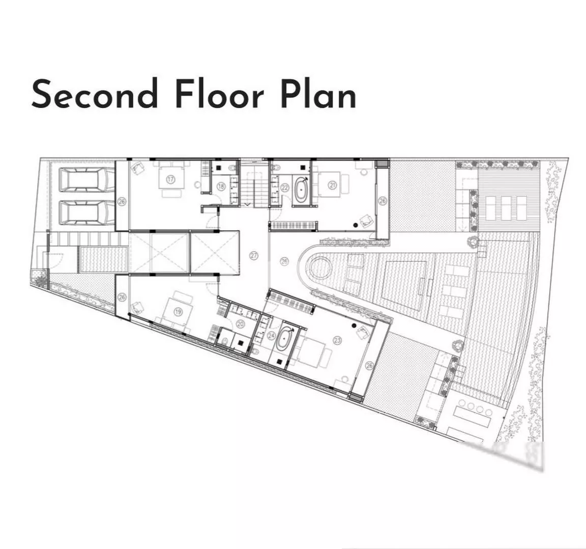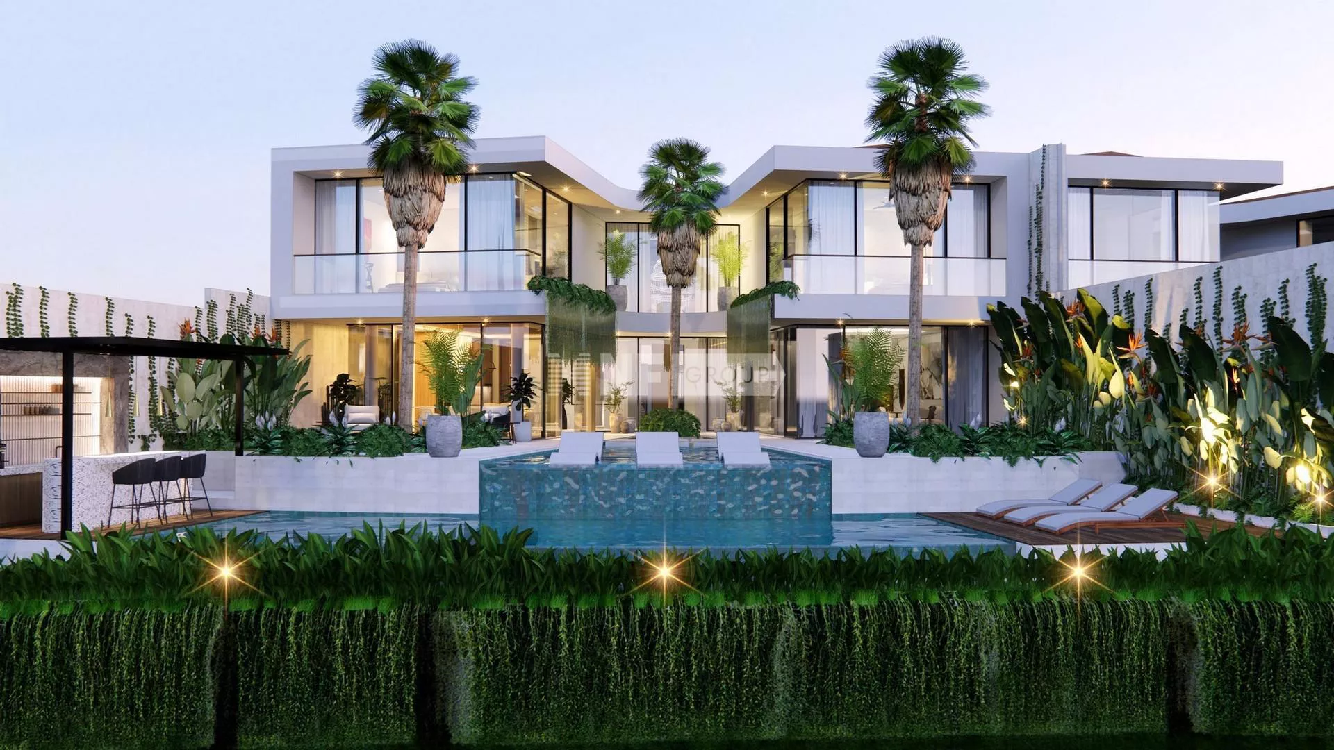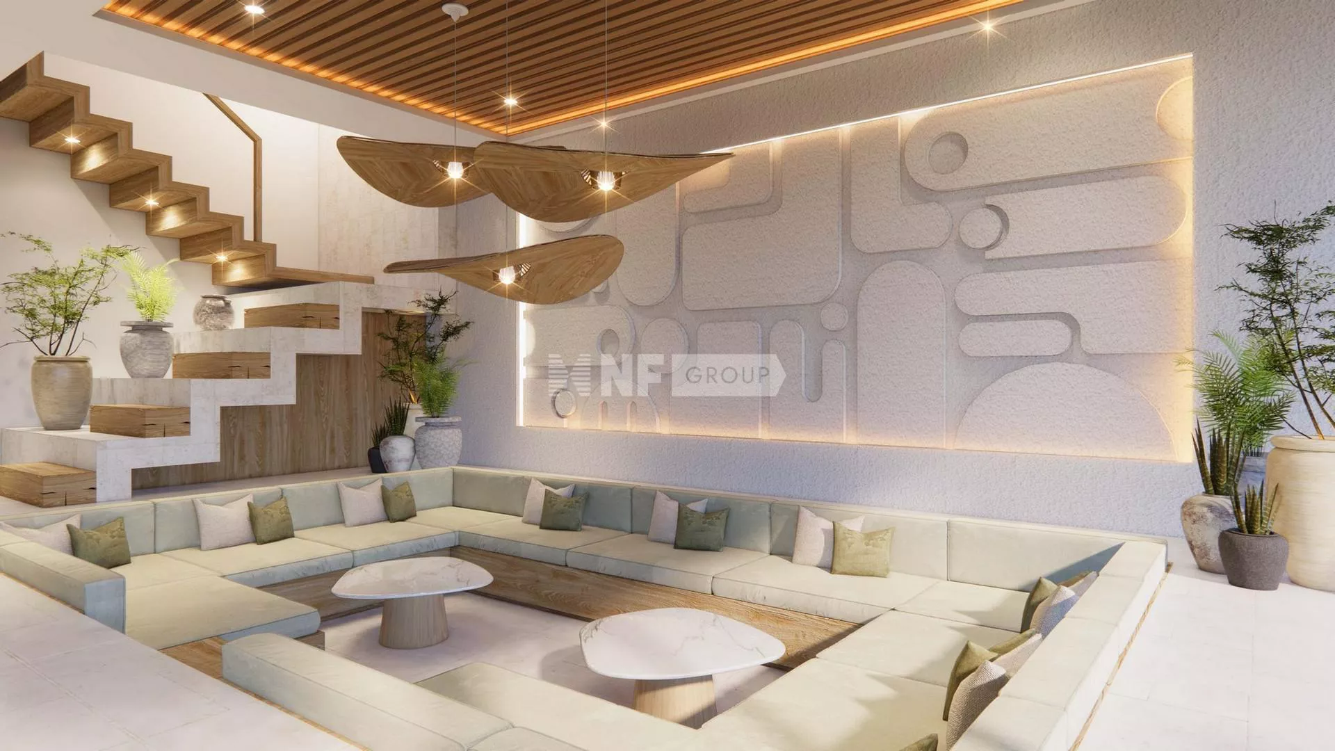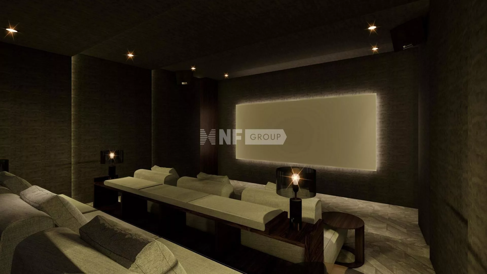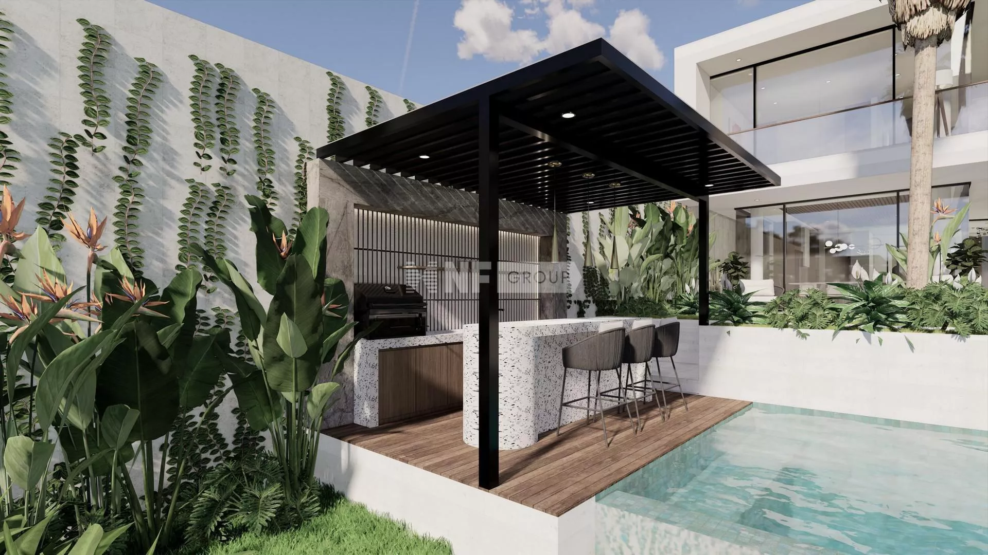Designed for both relaxation and entertainment, the villa boasts a rooftop leisure area, a private cinema room, and an inviting swimming pool complete with a jacuzzi and pool bar. A guest powder room and carport for two vehicles add further convenience.
