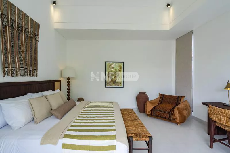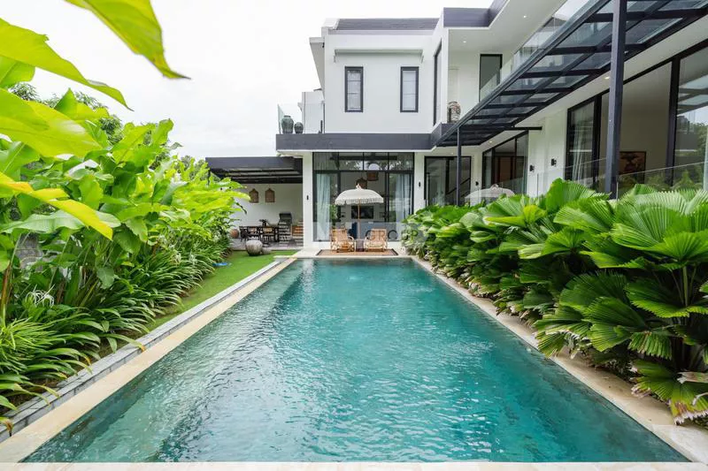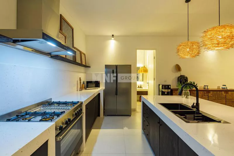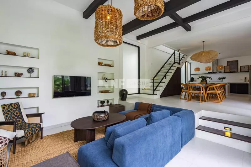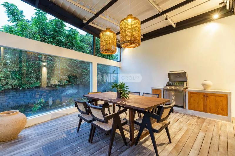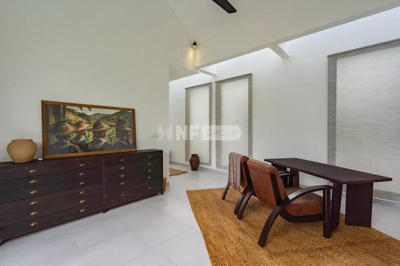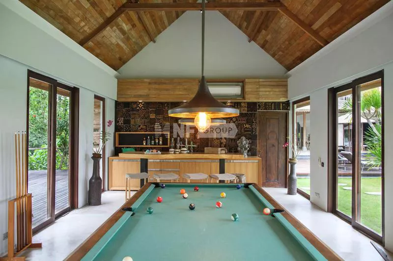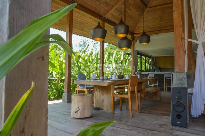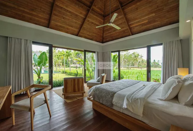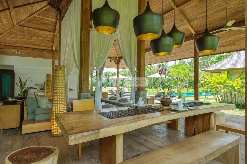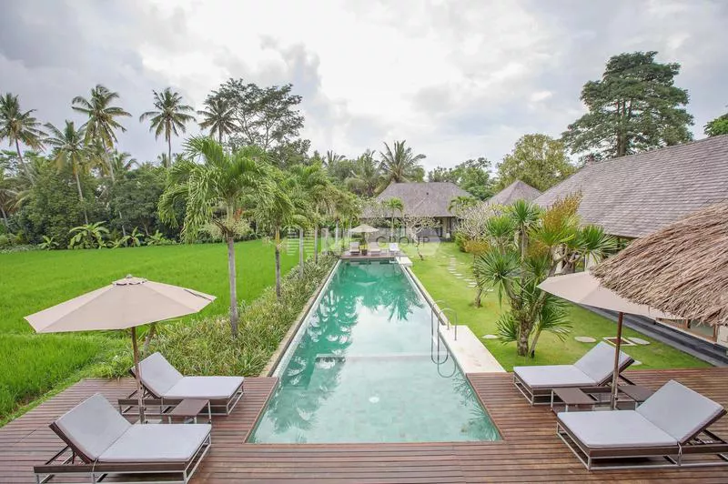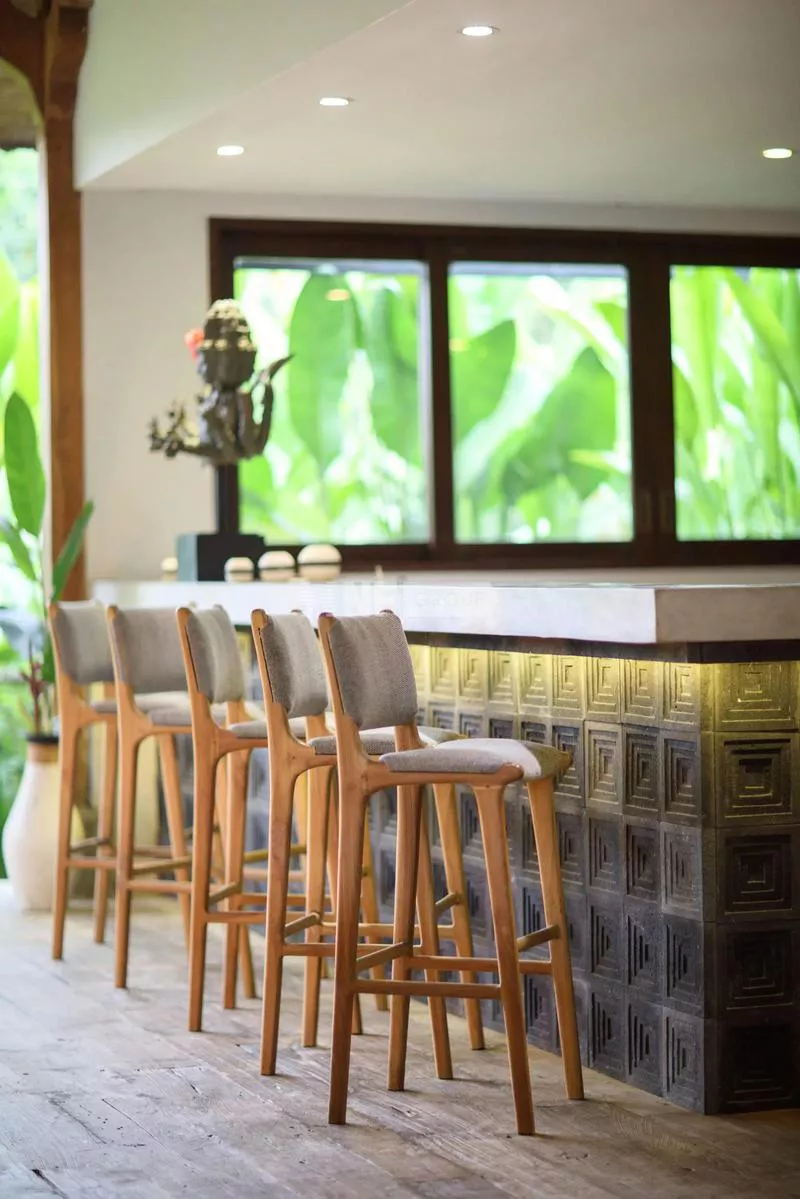 The heart of the property is an expansive open-plan living space overlooking the massive 13-metre swimming pool, the true centrepiece of the estate. A sun-soaked deck invites you to relax on loungers while enjoying uninterrupted rice field views. The fully equipped kitchen with island counter is ideal for home chefs, with dining options ranging from the elegant round table for eight to poolside al fresco experiences.