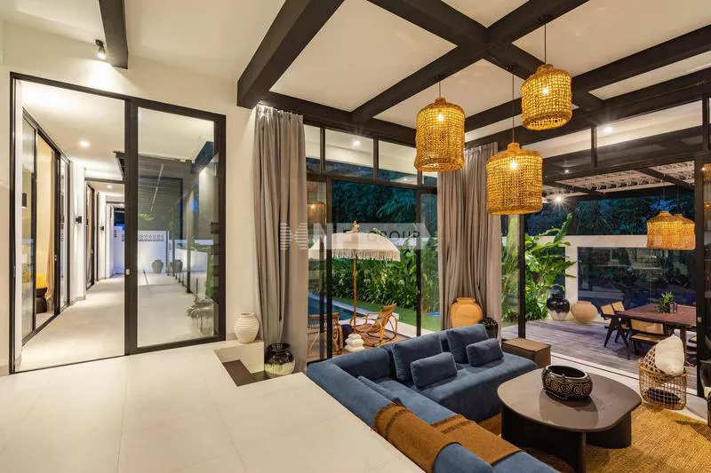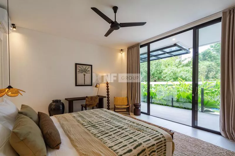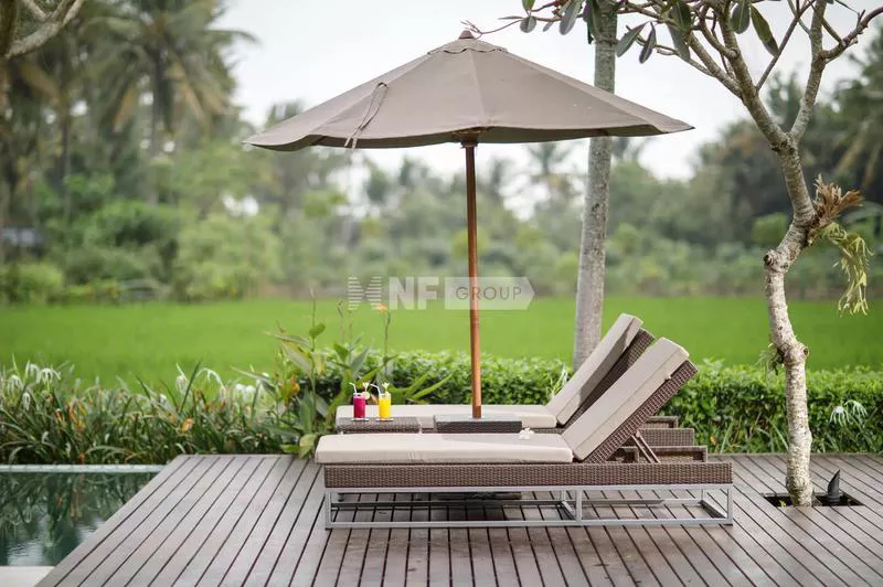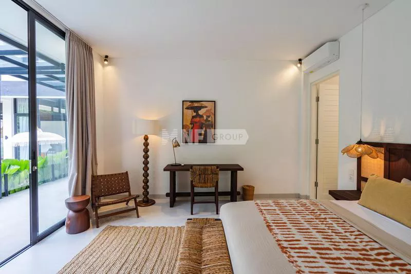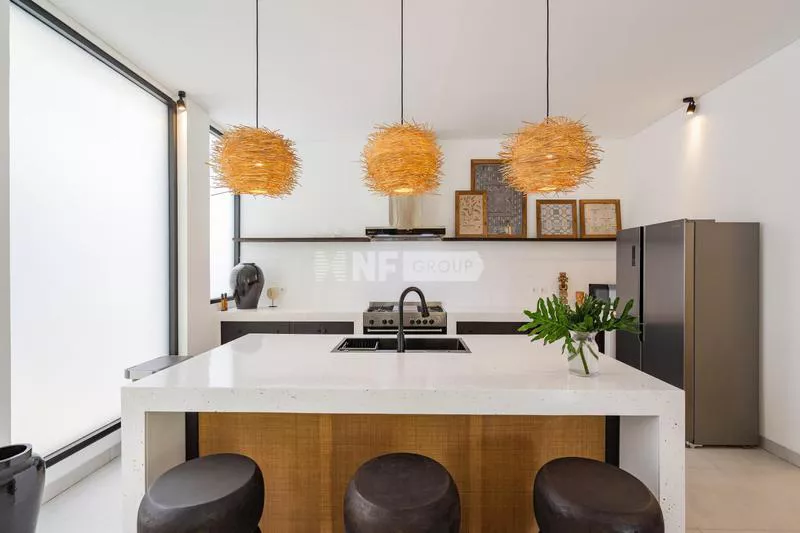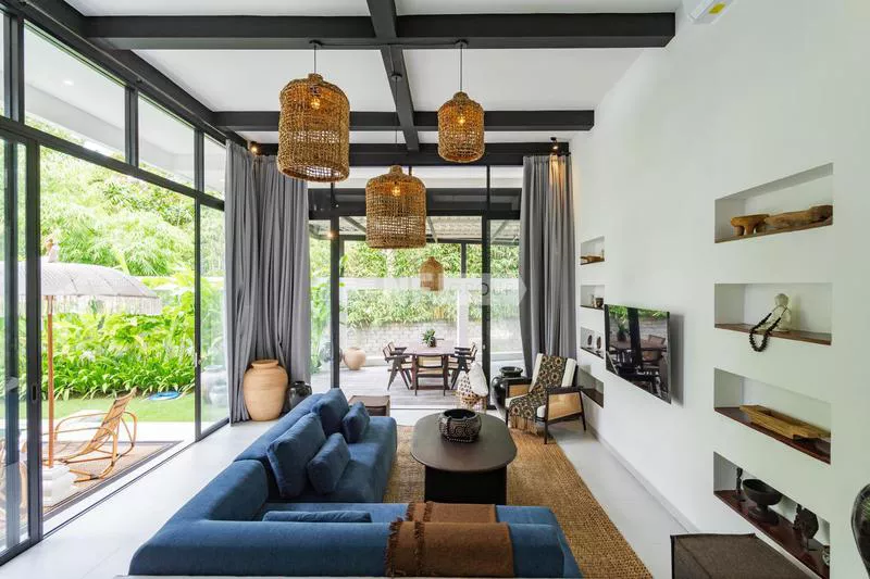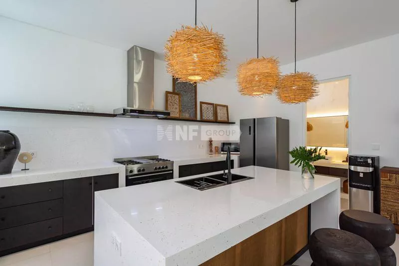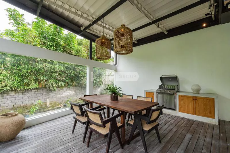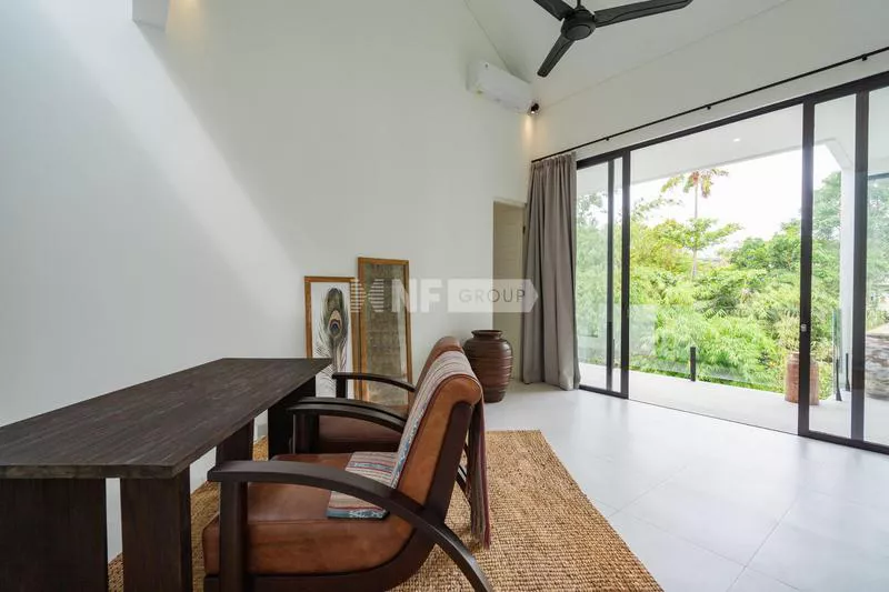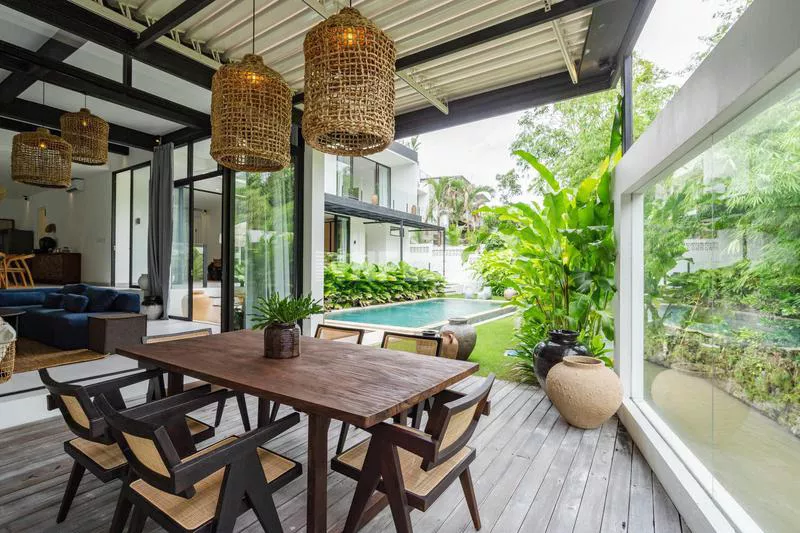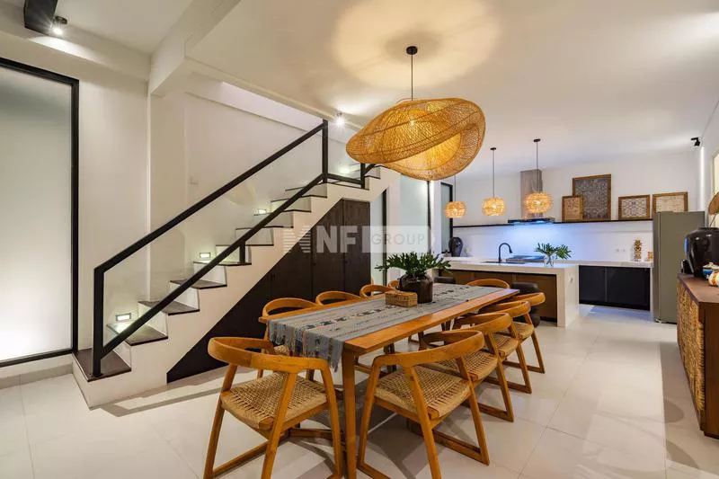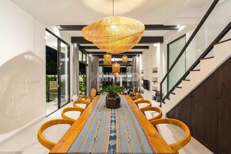 The heart of the property is an expansive open-plan living space overlooking the massive 13-metre swimming pool, the true centrepiece of the estate. A sun-soaked deck invites you to relax on loungers while enjoying uninterrupted rice field views. The fully equipped kitchen with island counter is ideal for home chefs, with dining options ranging from the elegant round table for eight to poolside al fresco experiences.
