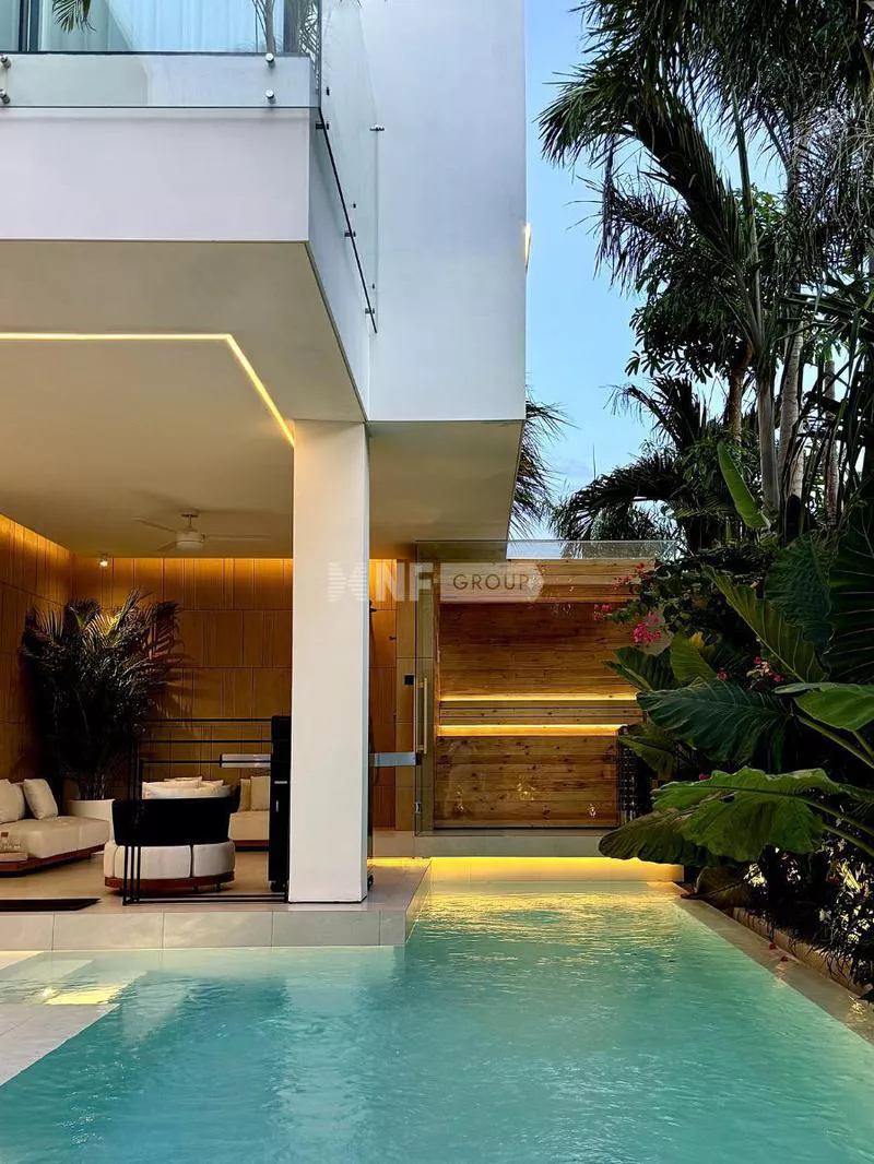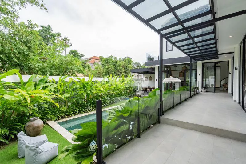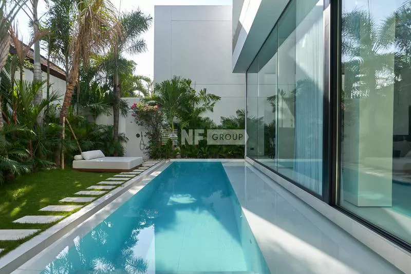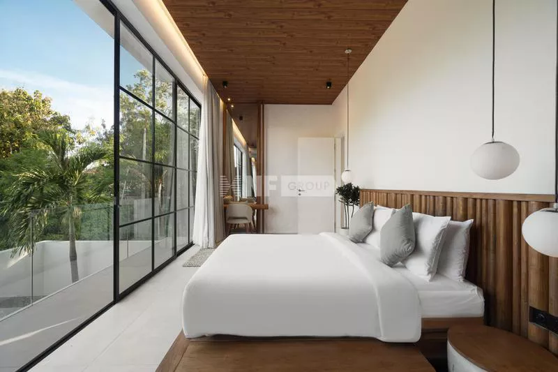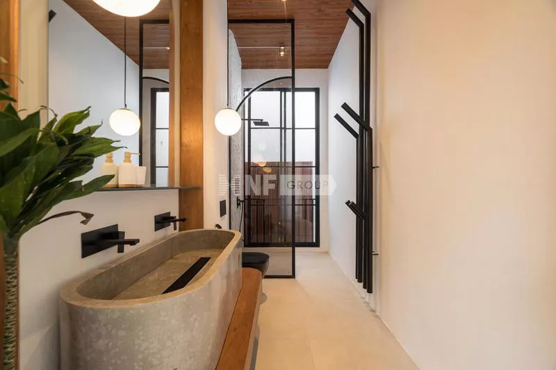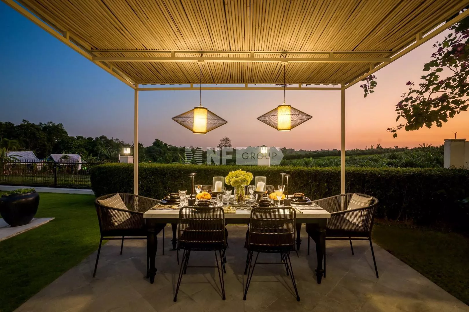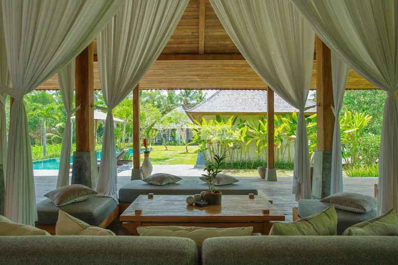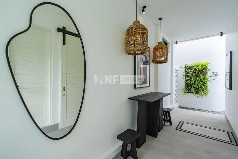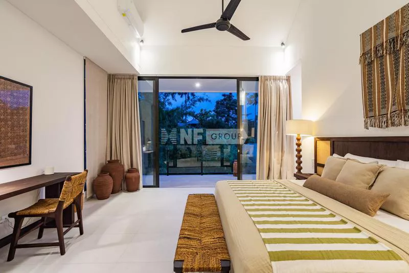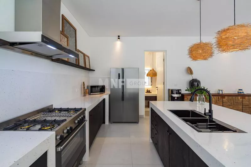 The heart of the property is an expansive open-plan living space overlooking the massive 13-metre swimming pool, the true centrepiece of the estate. A sun-soaked deck invites you to relax on loungers while enjoying uninterrupted rice field views. The fully equipped kitchen with island counter is ideal for home chefs, with dining options ranging from the elegant round table for eight to poolside al fresco experiences.