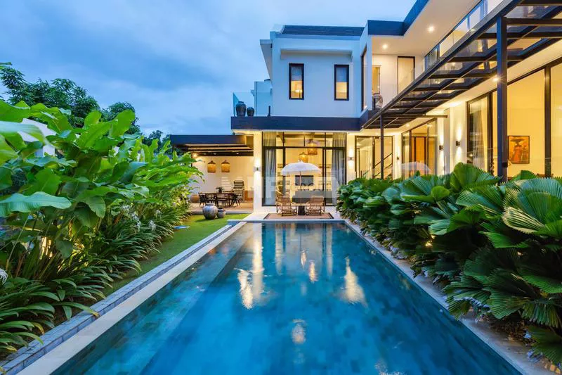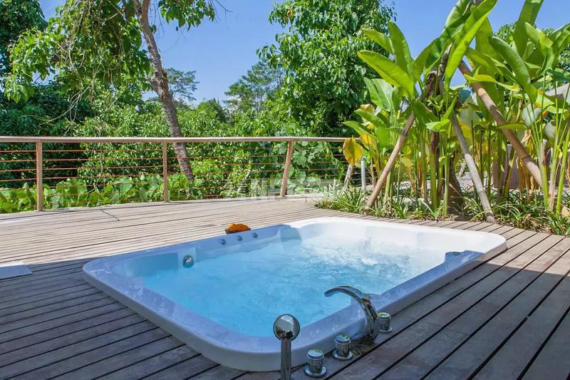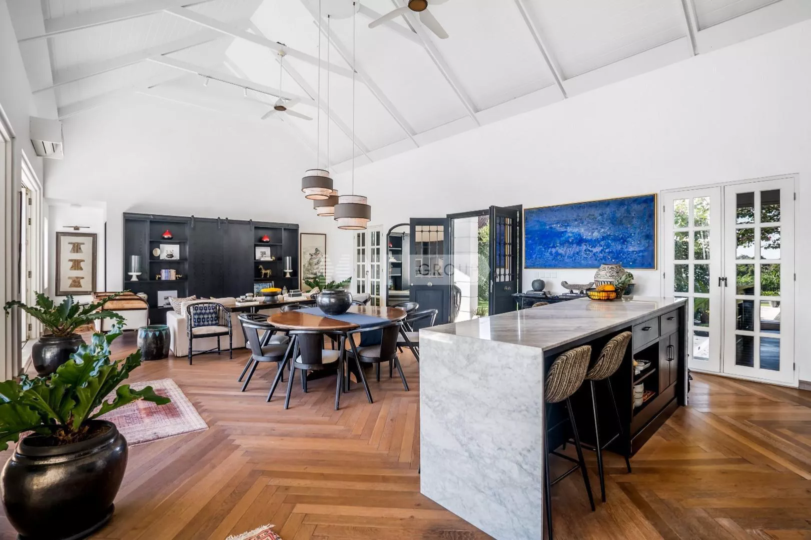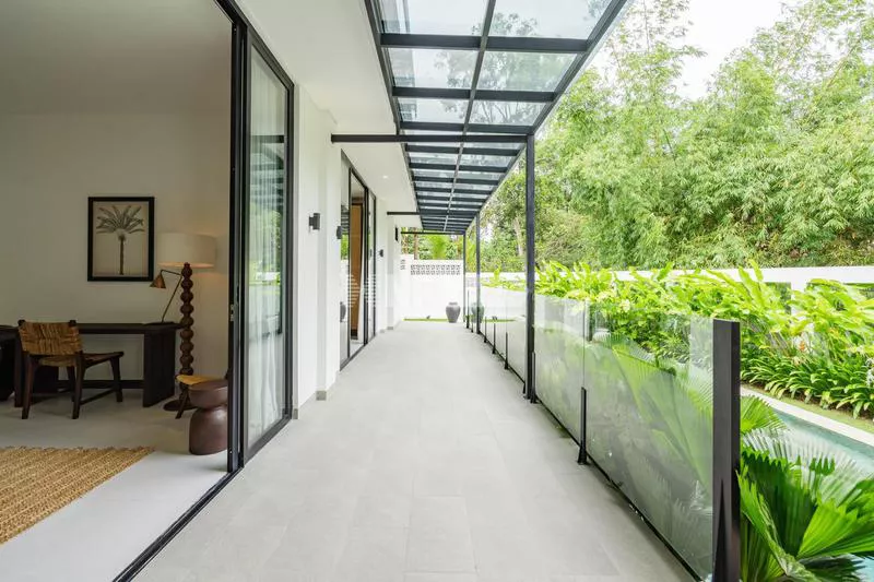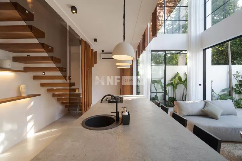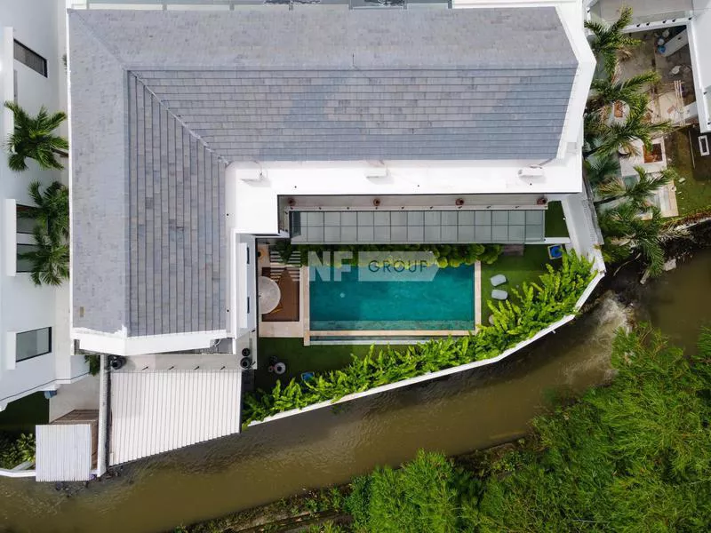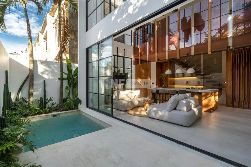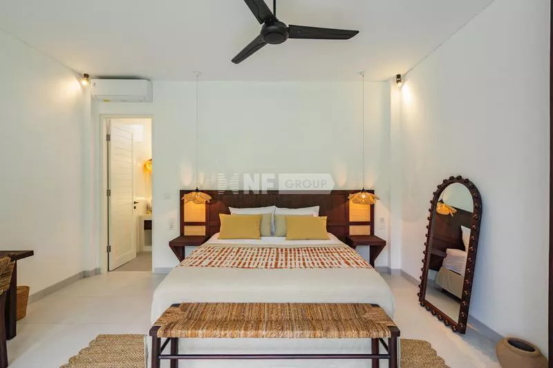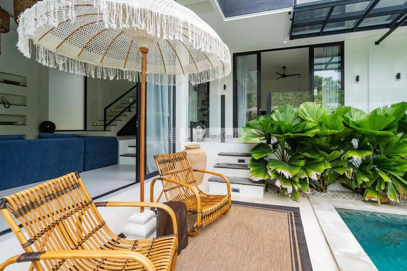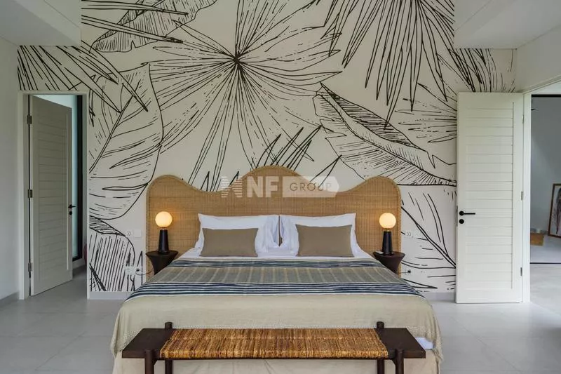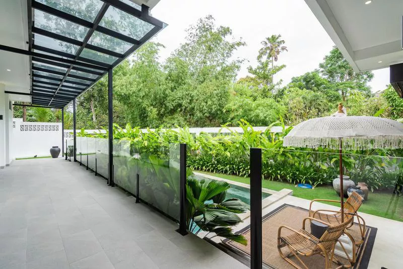 The heart of the property is an expansive open-plan living space overlooking the massive 13-metre swimming pool, the true centrepiece of the estate. A sun-soaked deck invites you to relax on loungers while enjoying uninterrupted rice field views. The fully equipped kitchen with island counter is ideal for home chefs, with dining options ranging from the elegant round table for eight to poolside al fresco experiences.