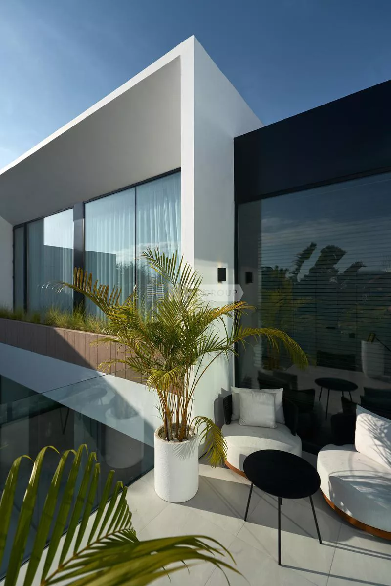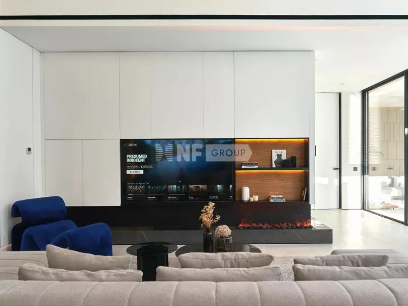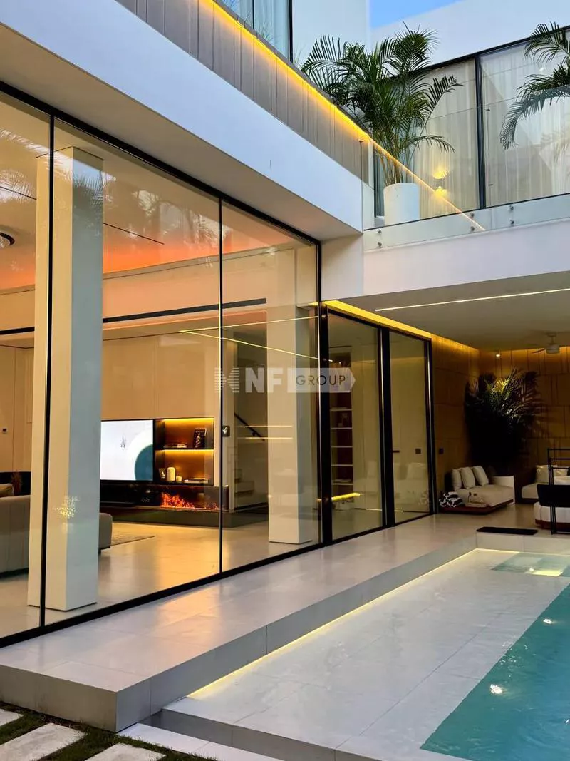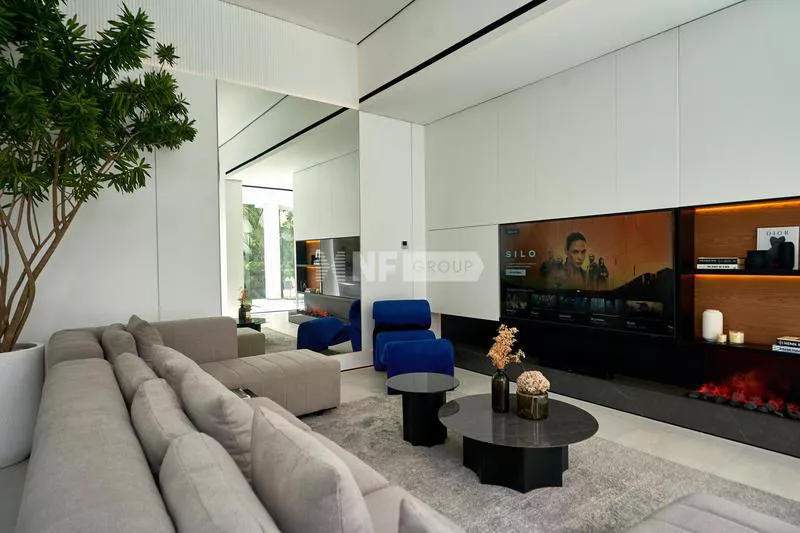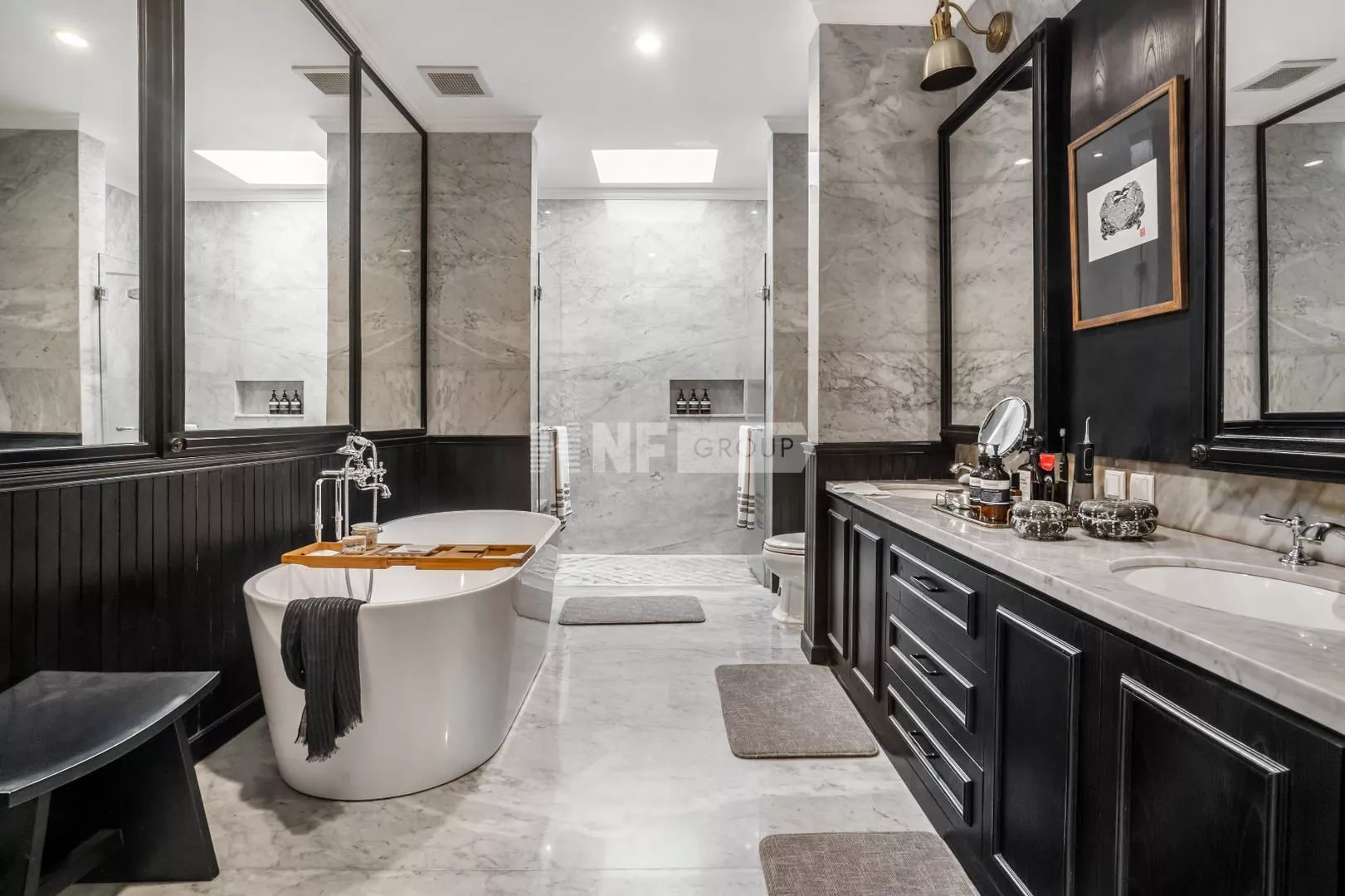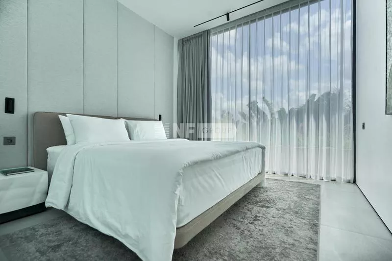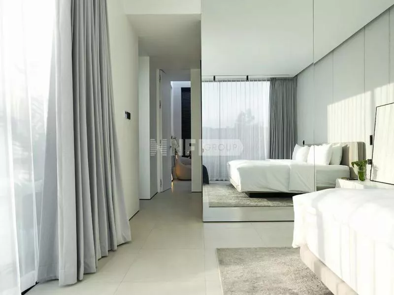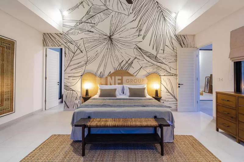 The master suite is a private sanctuary with 90-degree views, an imported king-size bed, walk-in wardrobe, marble bathroom with bathtub, private study, and a serene terrace. The three additional bedrooms are equally lavish, ensuring comfort for family or guests. Supporting amenities include a wet kitchen, guest powder room, two staff rooms, and parking for up to four cars.