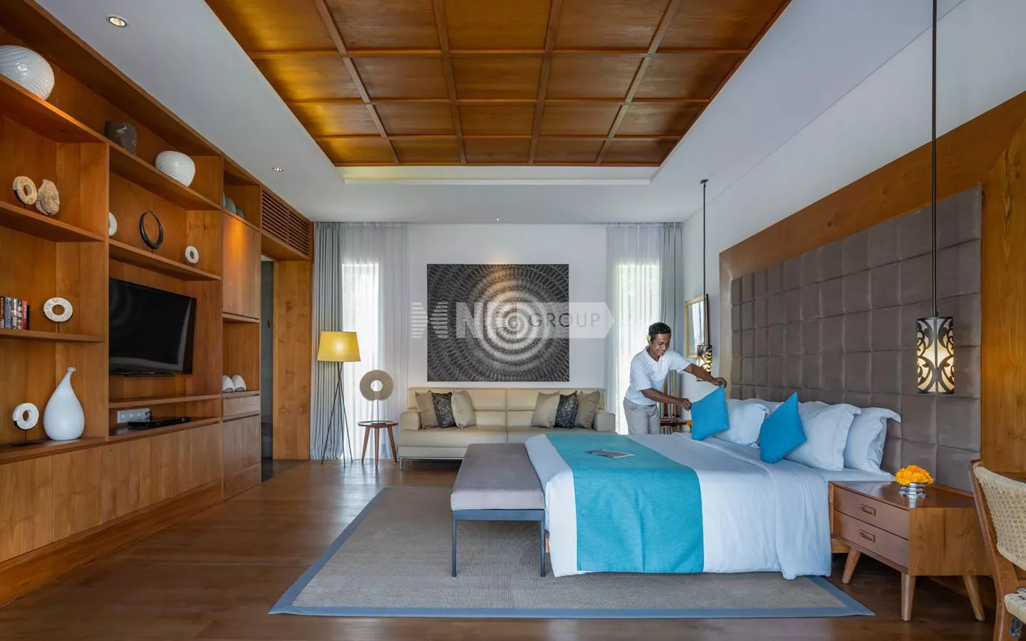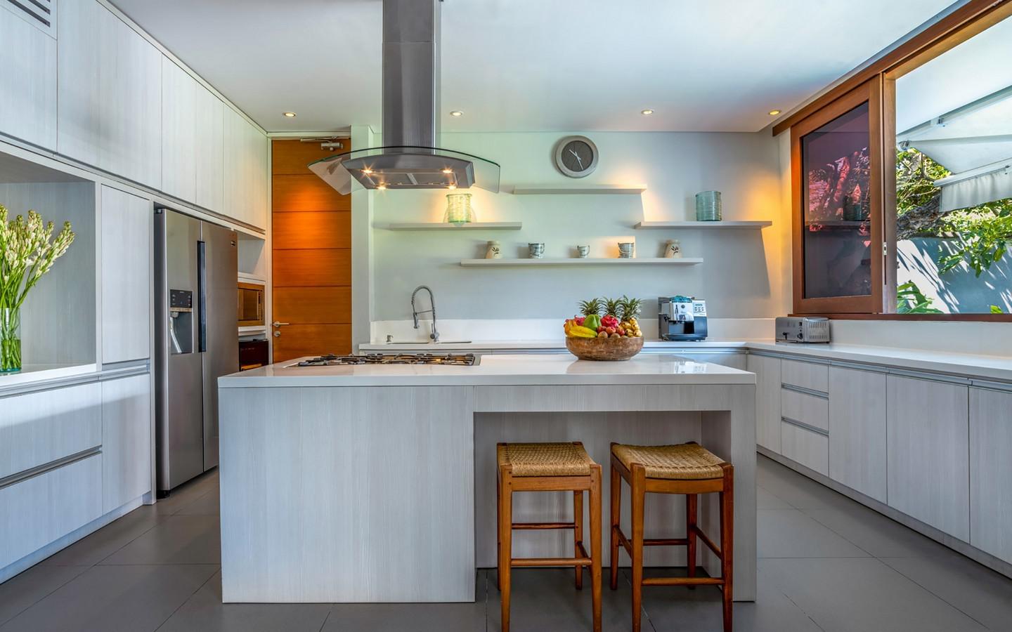 The villa was renovated in 2012. The interiors of the villa look fresh and cosy thanks to whitewashed walls, smooth palimanan stone floors, warm wooden accents and carefully selected contemporary artwork. Richly textured furniture is complemented by authentic Indonesian artefacts, giving the villa a refined yet soulful character. Set on a 900 sqm plot, with 700 sqm of living space spread over two floors, the layout includes a spacious open-plan living and dining area overlooking the pool and lush gardens, as well as a dedicated staff area and parking for five cars.
