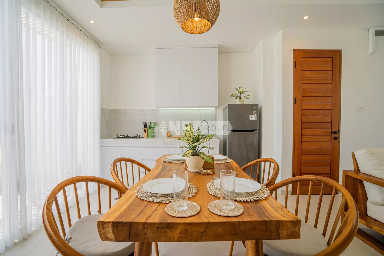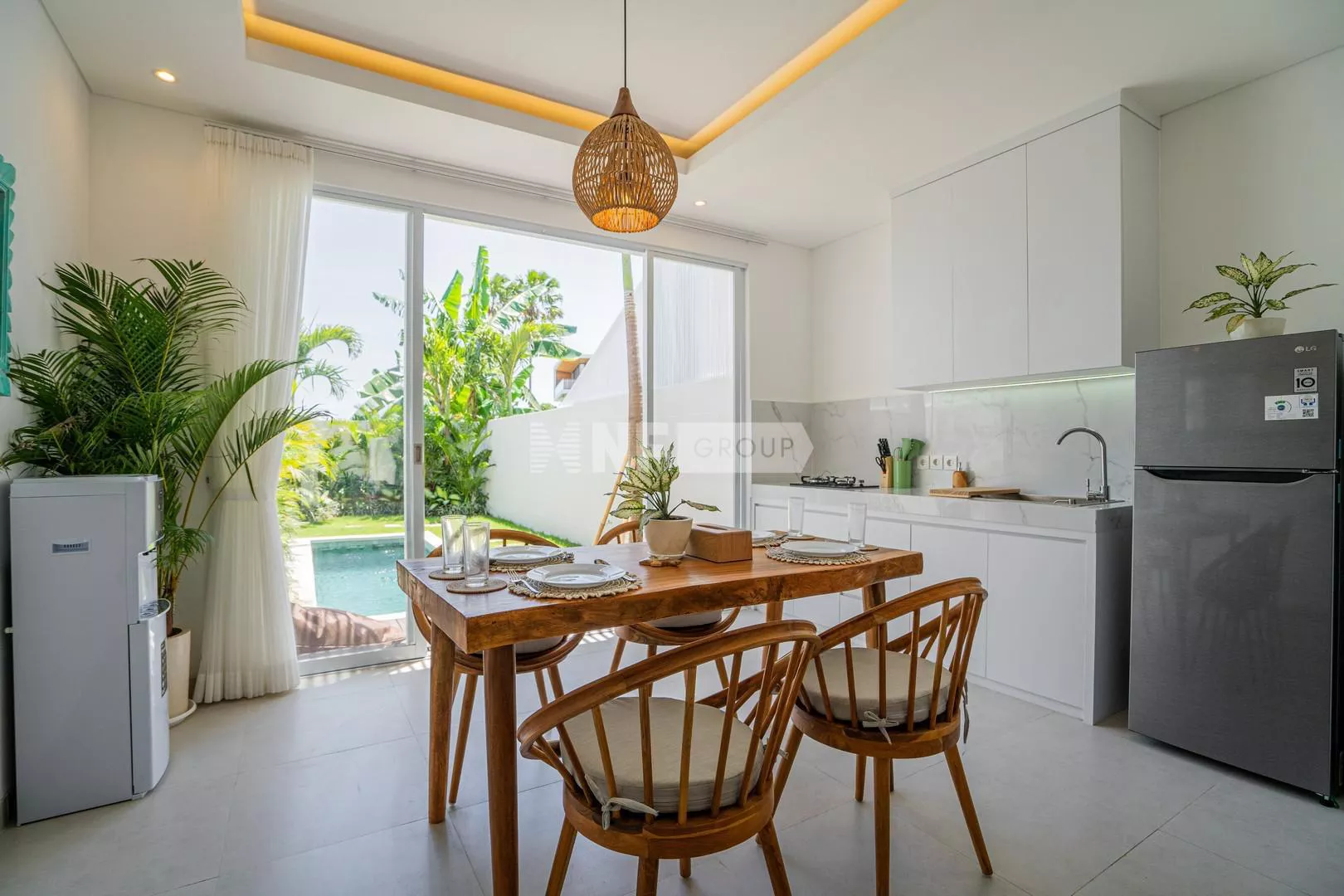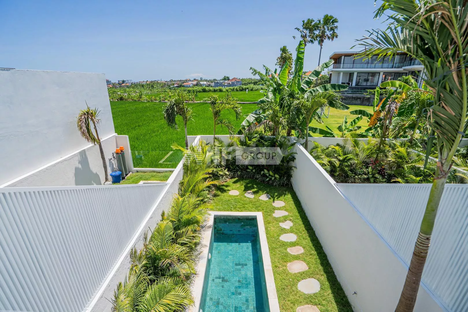 The villa features two spacious bedrooms, each with an ensuite bathroom fitted with rain showers. A closed kitchen, dining, and living area create a seamless and private indoor space, perfect for relaxation or entertaining. Outside, a sleek 5.5 x 2-meter private pool invites you to unwind while enjoying serene rice field views.