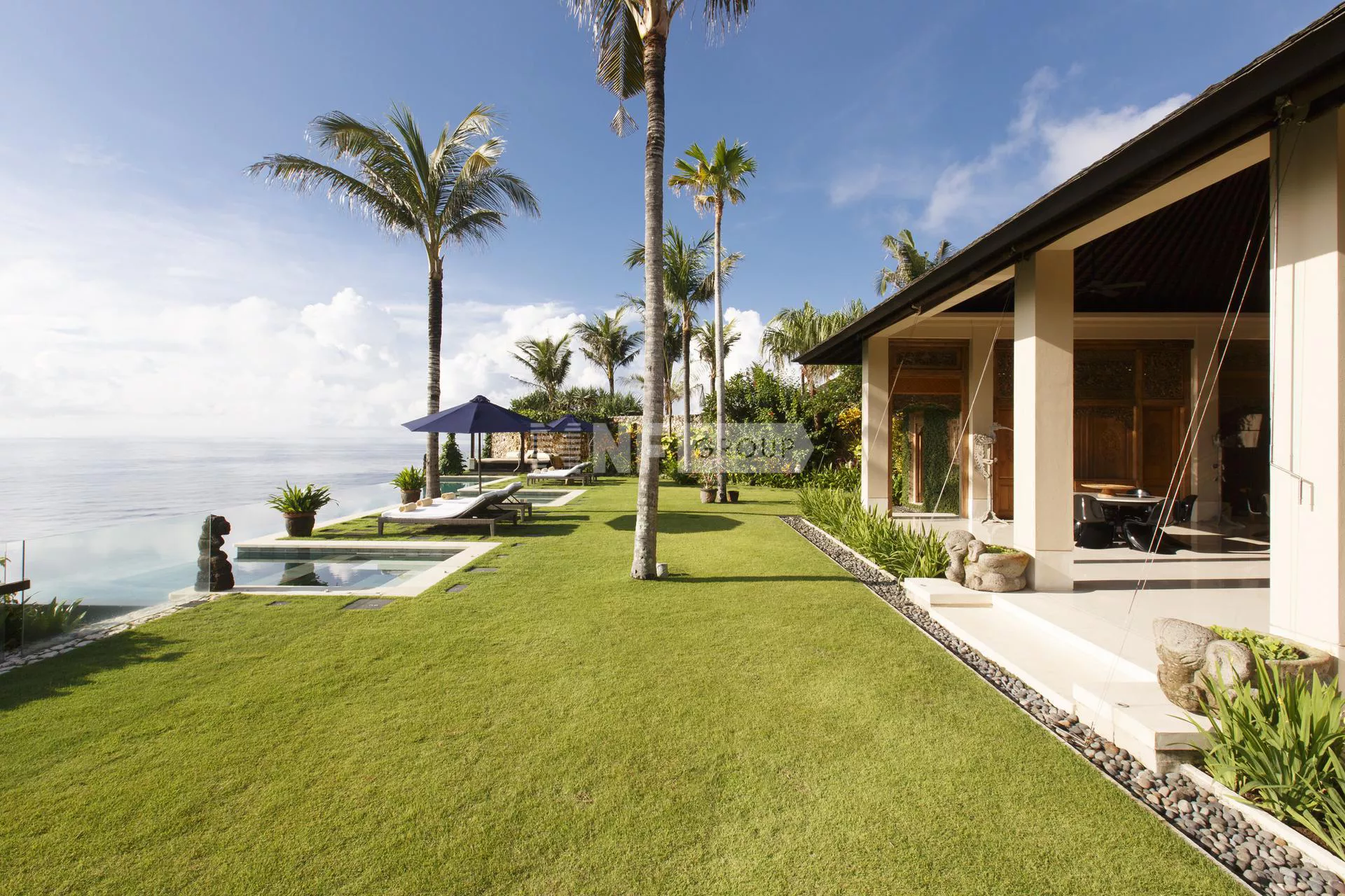 This villa spans 750 sqm over two meticulously designed levels, boasting grand indoor and outdoor spaces. The main entertainment area sits dramatically on the cliff’s edge, featuring an infinity pool, plush lounges, and a tranquil bale, all surrounded by manicured lawns. Guests will revel in five air-conditioned bedrooms, each with en-suite bathrooms, double vanities, and luxurious soaking tubs, ensuring the epitome of comfort. Additional amenities include a cinema room, integrated sound system, and a fully equipped kitchen paired with dining space for twelve.