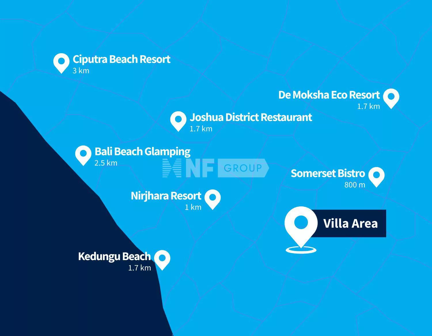 Only 9-minutes to Kedungu surf beach, 20-minutes to Canggu beach, and close to Nijhara Resort, Bali Beach Glamping, and Joshua District. The villa is situated within convenient reach of exclusive villas and one of Asia's best golf courses. Watch the sun setting over Tanah Lot Temple, and soak up the magic of beautiful Kedungu Beach.