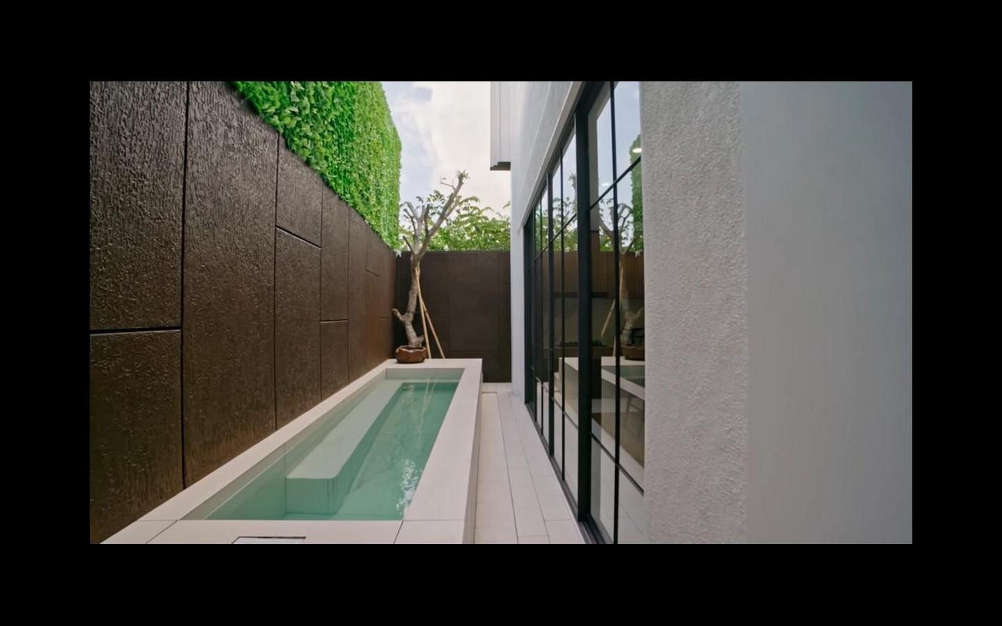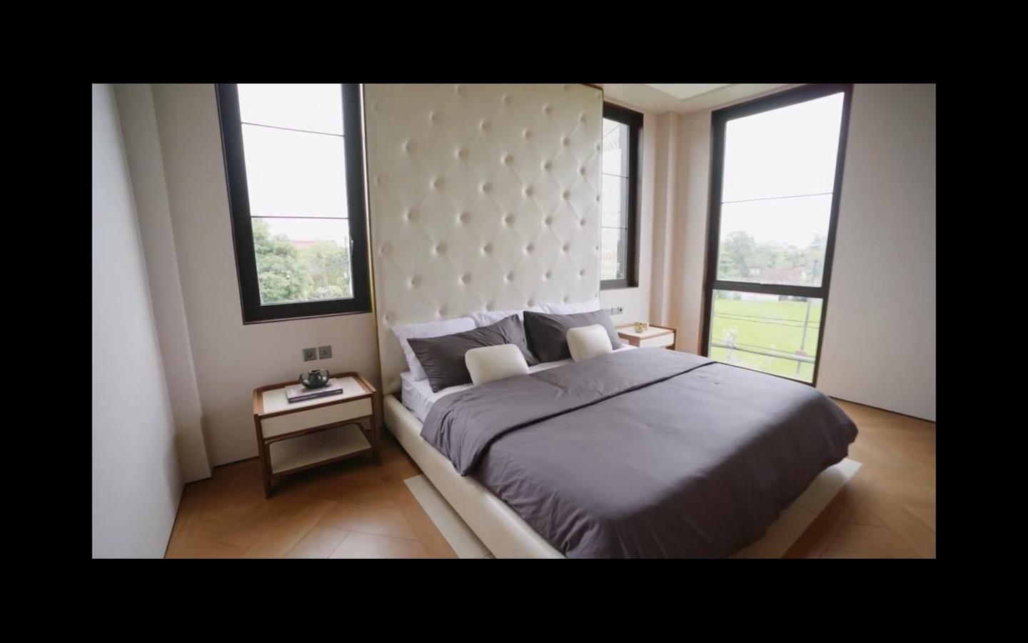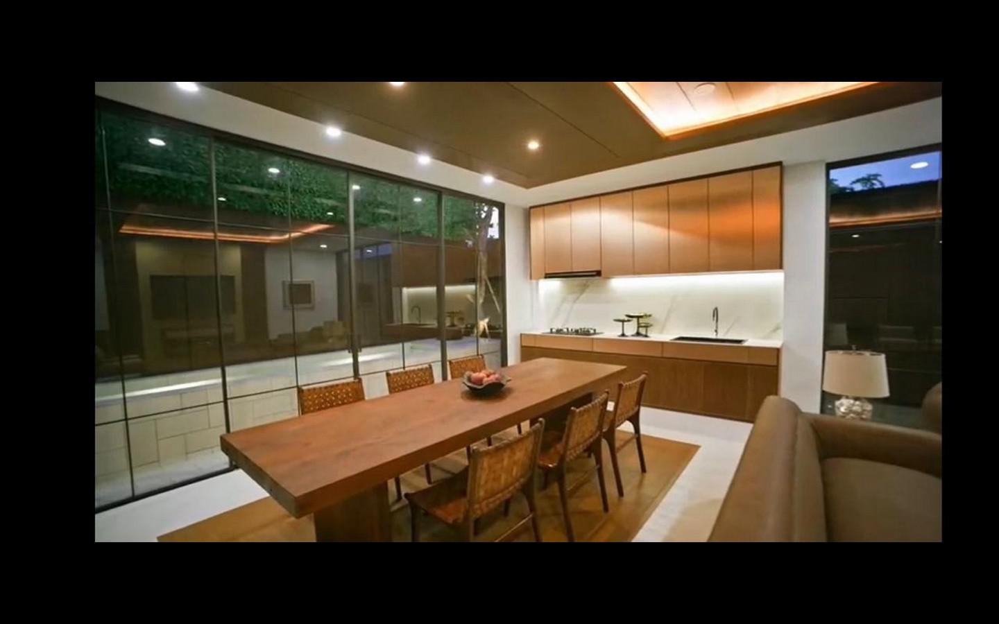 Inside, the villa features exquisite details. The elegant finishes include Toto and Austindo sanitary ware, Dekton flooring and custom-made Italian aluminium elements. The living areas, including a cosy living room, stylish dining room and family dining area with bar counter, exude sophistication and warmth in equal measure.