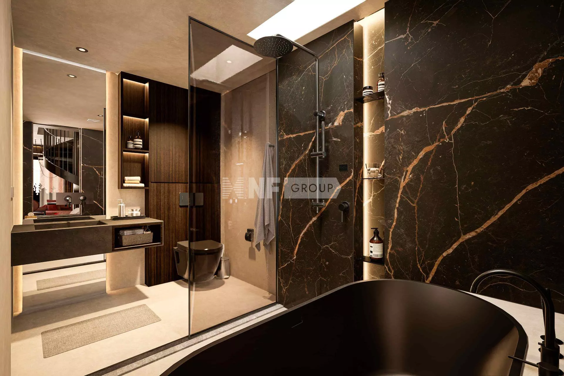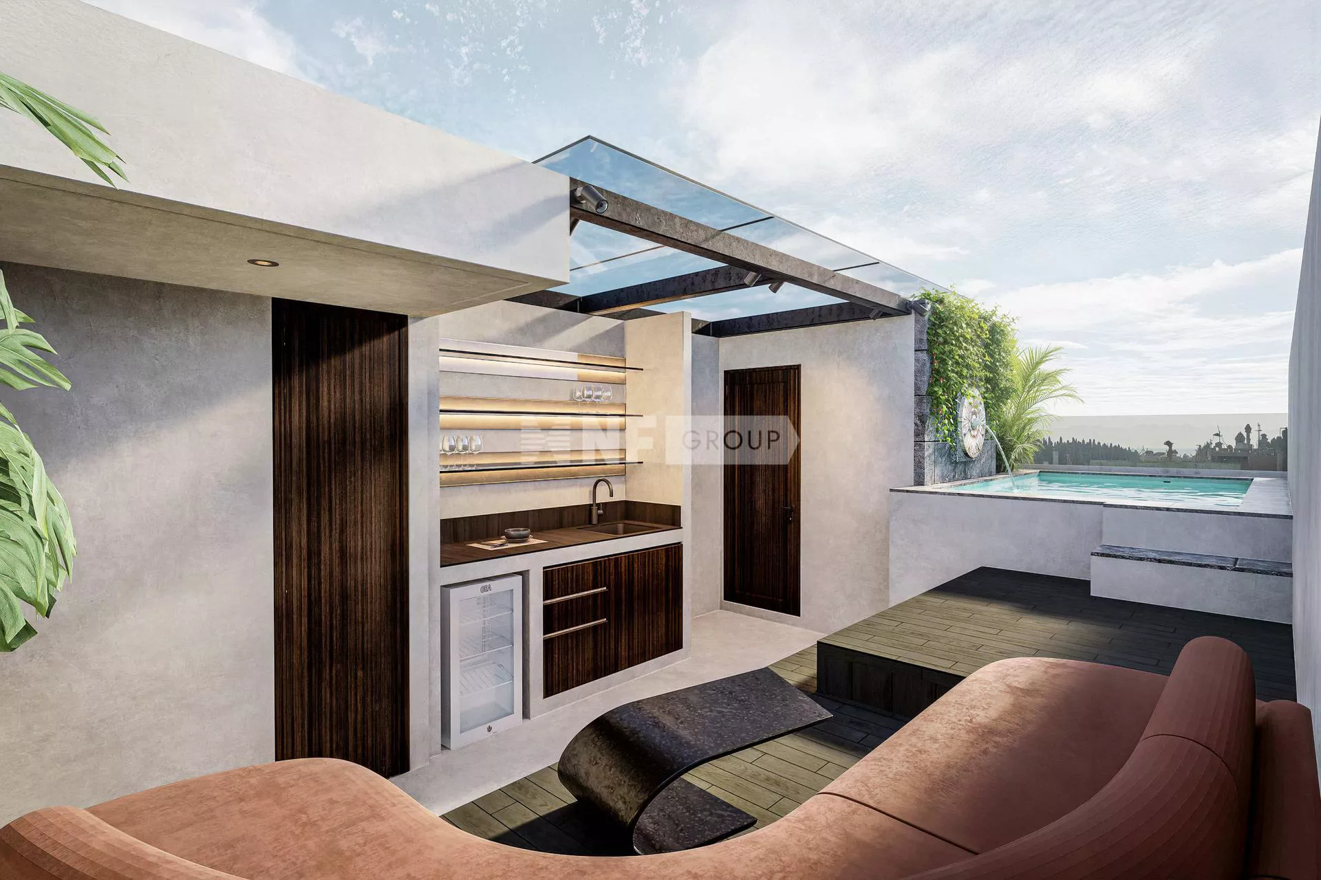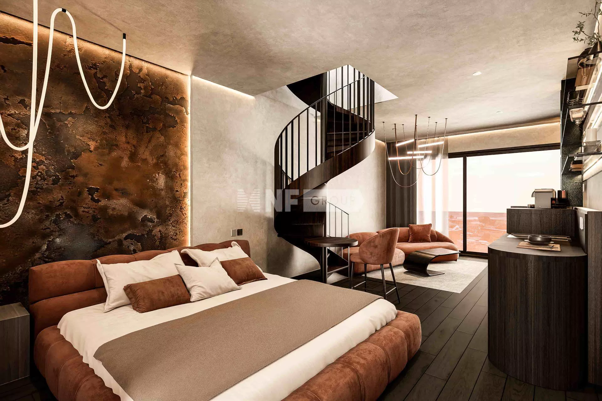 A spacious studio with an elegant blend of indoor and outdoor living. The layout includes a built-in kitchenette, cozy seating area and a visually separated sleeping area. The rooftop terrace with a plunge pool creates the perfect retreat, offering luxury living in a prime location.