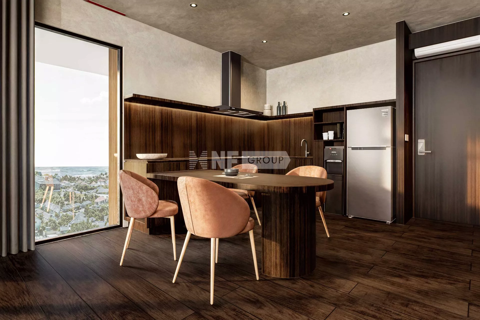 A spacious two-bedroom duplex with an elegant blend of indoor and outdoor living. The lower level features a full kitchen, dining area, and guest bedroom, while the upper level boasts a master suite with a private balcony. The rooftop terrace with a plunge pool creates the perfect retreat, offering luxury living in a prime location.