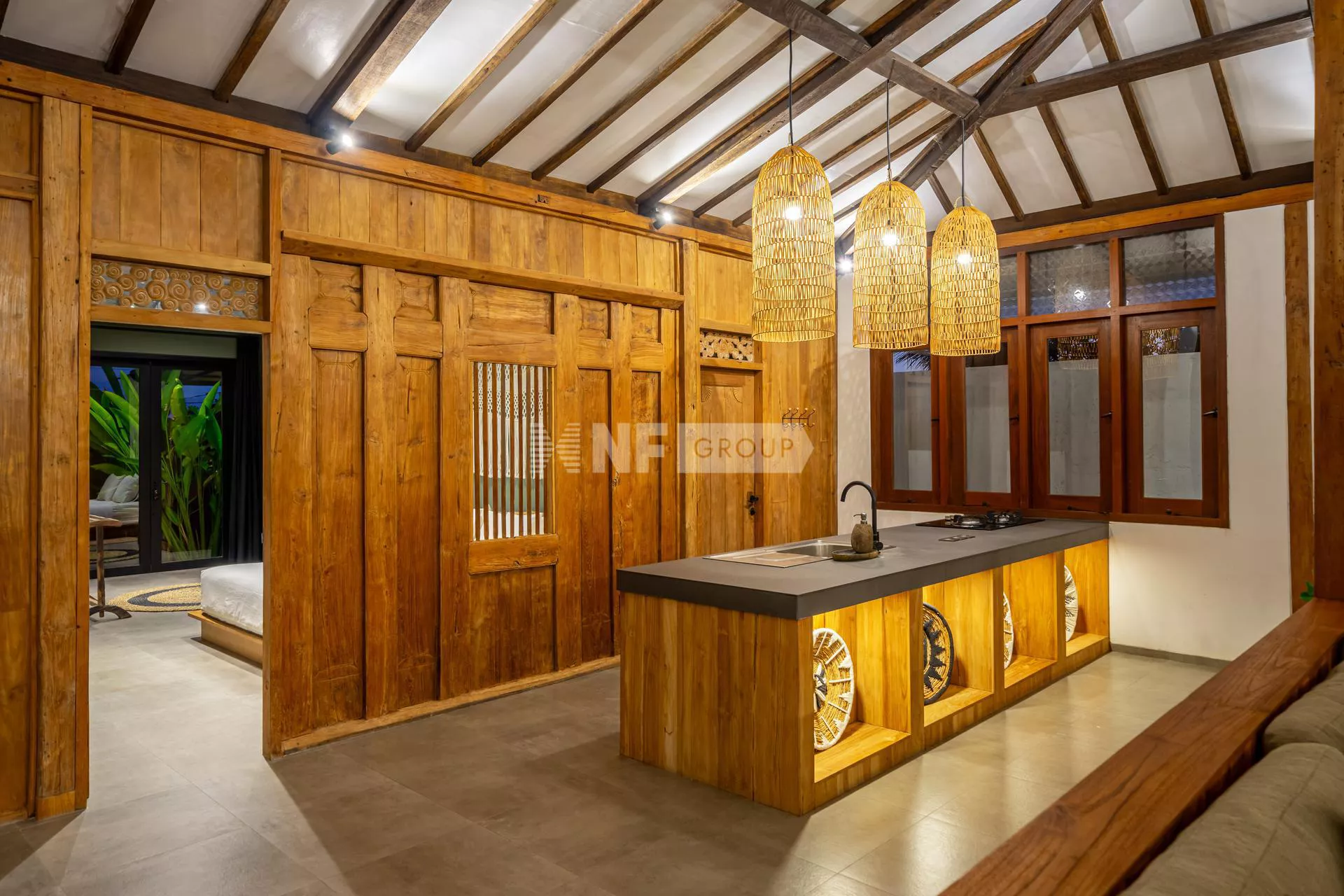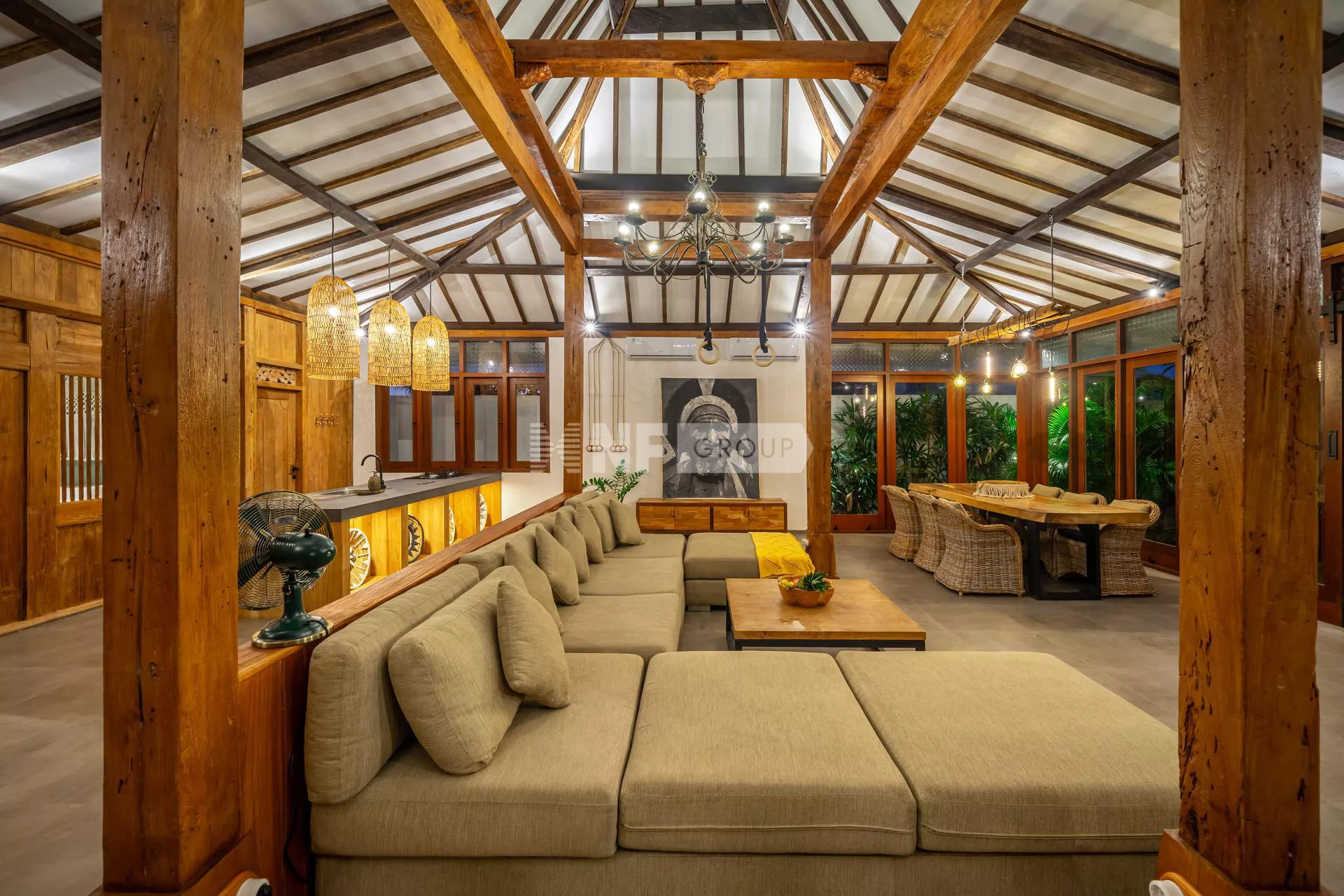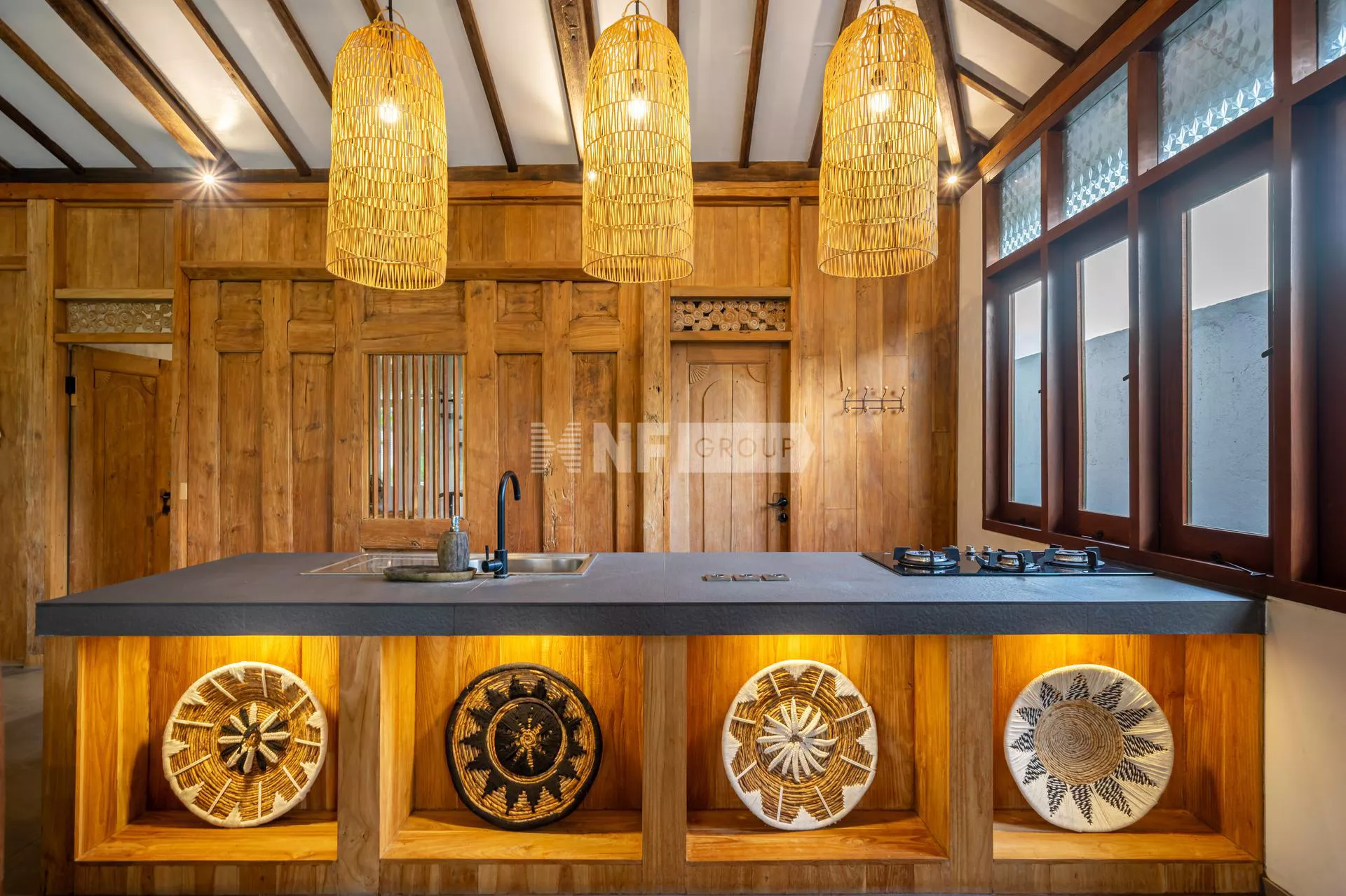 Framed by sweeping rice-field views, this elegant two-bedroom villa captures the essence of Bali’s charm. At its heart stands a masterfully restored 90-year-old Javanese teak Joglo — a piece of living history that effortlessly merges traditional craftsmanship with contemporary comfort.