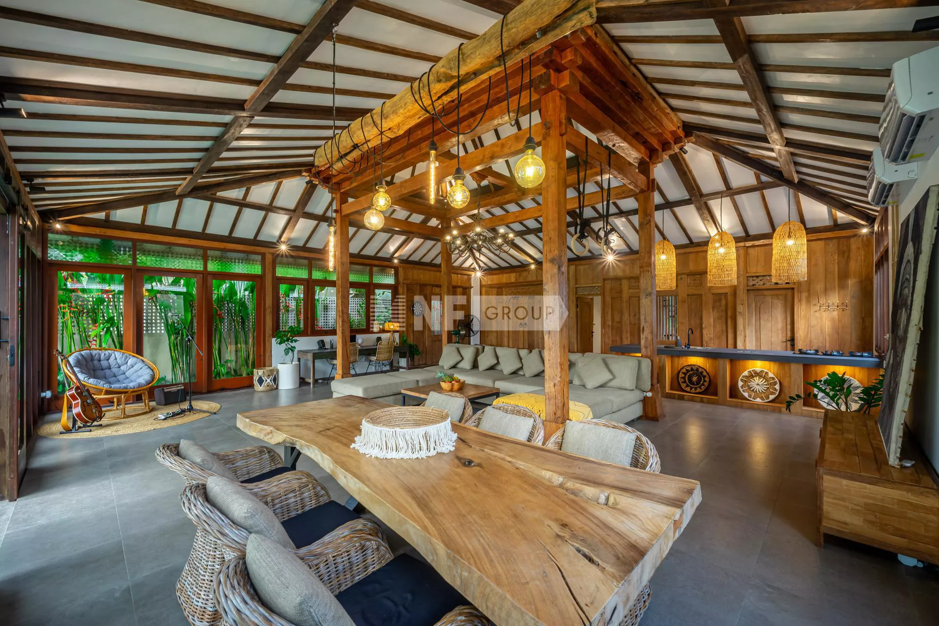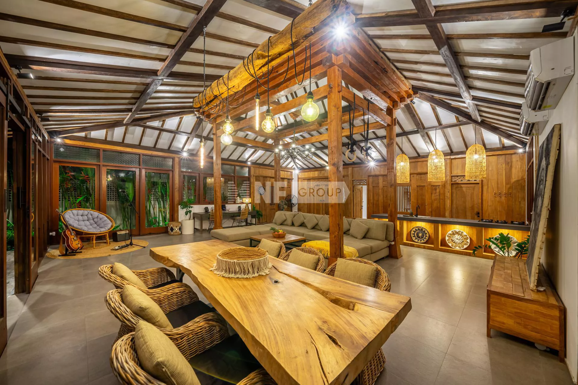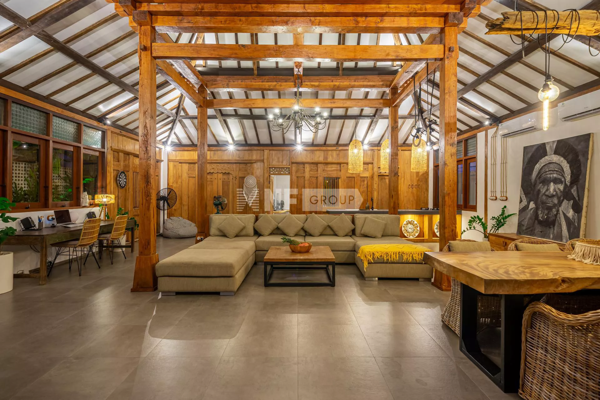 Framed by sweeping rice-field views, this elegant two-bedroom villa captures the essence of Bali’s charm. At its heart stands a masterfully restored 90-year-old Javanese teak Joglo — a piece of living history that effortlessly merges traditional craftsmanship with contemporary comfort.