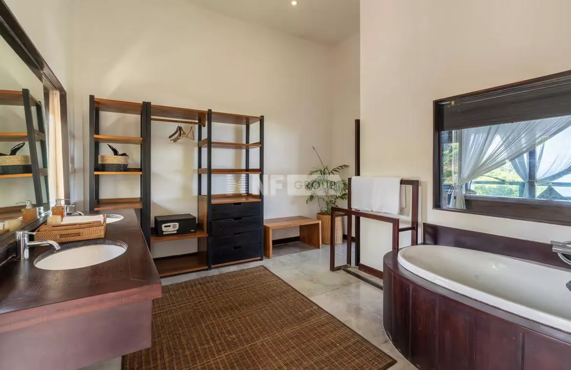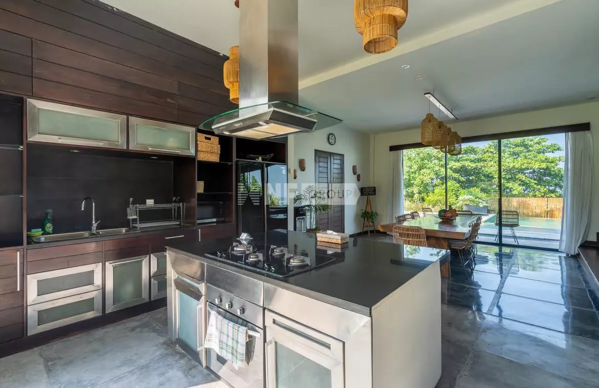The guest pavilion provides two additional en-suite bedrooms with their own sitting areas, each opening onto lush gardens, partial ocean views, and a 30-meter lap pool.