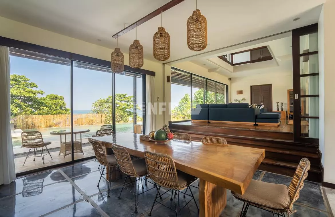 The residence features a striking two-story main villa paired with a single-level L-shaped guest pavilion. Inside the main villa, floor-to-ceiling glass frames the ocean, flooding the expansive living and dining areas with natural light. The dining space, designed for ten, seamlessly shifts between air-conditioned comfort and open-air elegance, while the adjoining contemporary kitchen ensures effortless entertaining. Upstairs, a private media lounge offers the ultimate setting for movie nights or quiet retreat.