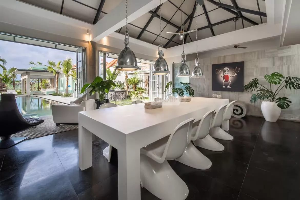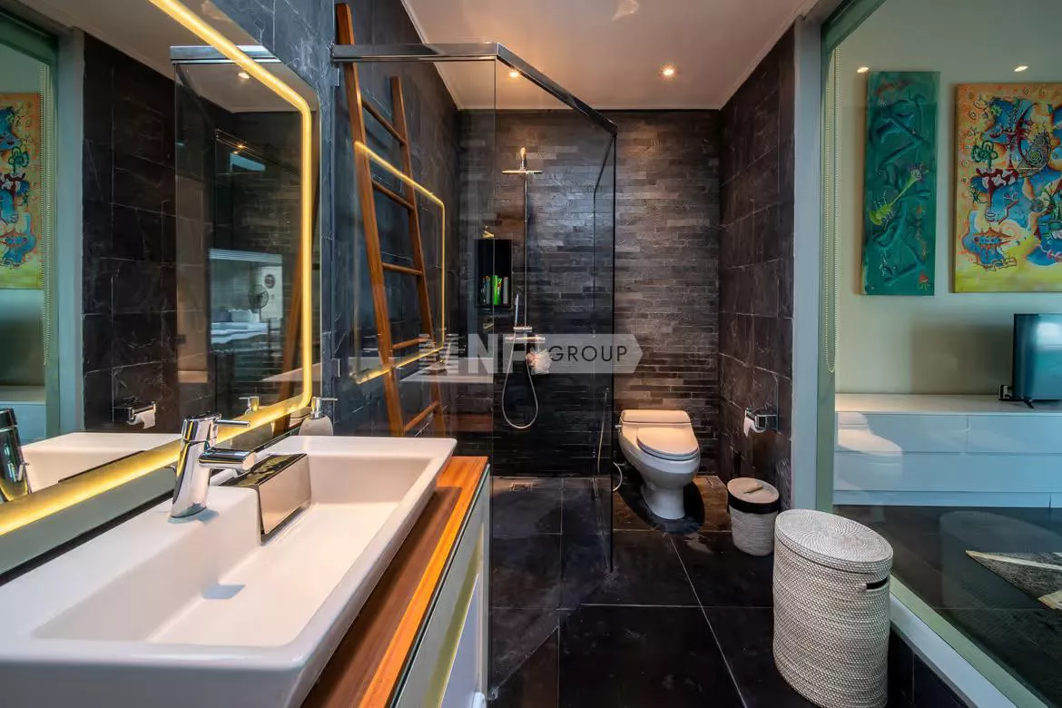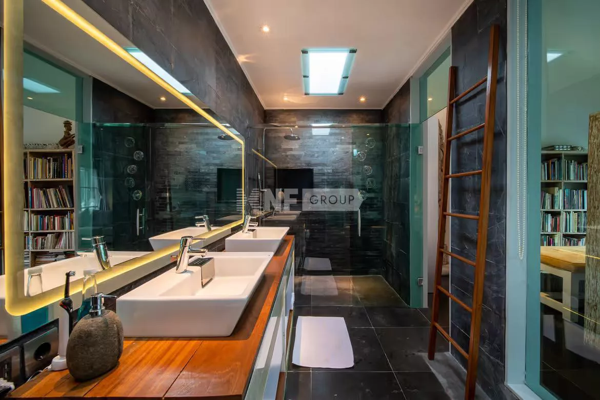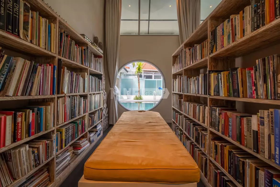 Four spacious bedrooms, each with lofty ceilings and private en-suite bathrooms, promise restful retreats. The master suite boasts a walk-in wardrobe, while one bedroom has been thoughtfully designed with a dedicated workspace. A tranquil library, easily transformed into a spa or massage room, adds a layer of indulgent wellness to the villa’s character.