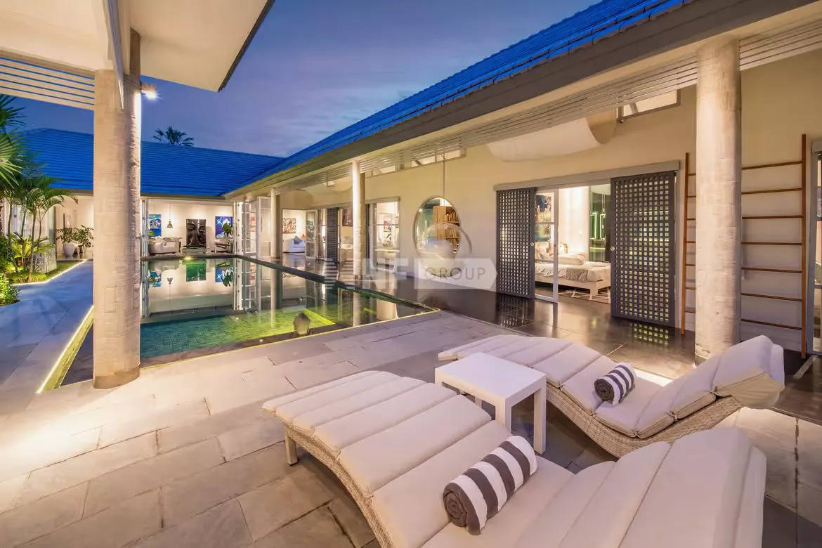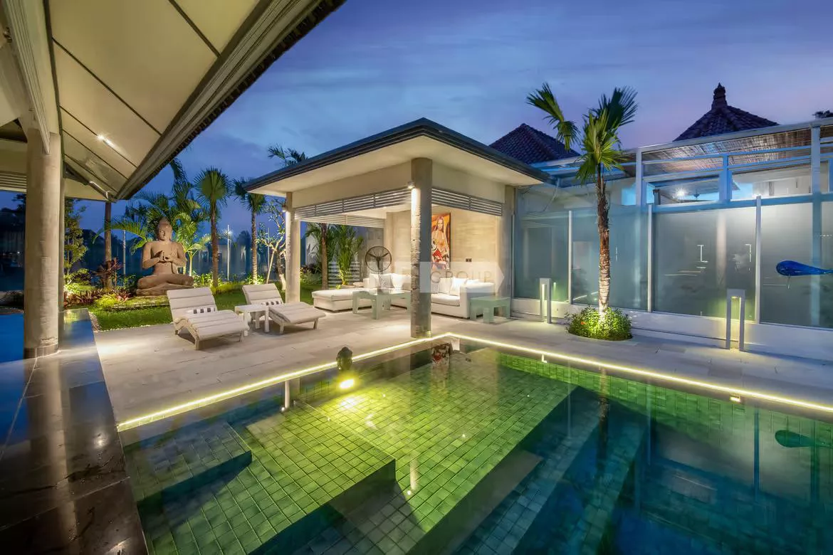 The landscaped garden reveals a unique Jacuzzi adorned with traditional Balinese motifs—an inviting retreat for sun-soaked afternoons. At the far end of the pool, a covered pavilion with plush seating and sunbeds provides the ideal setting for leisurely days or evening cocktails.