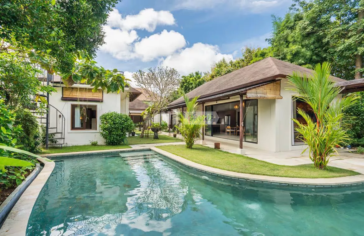 Outdoors, a free-form swimming pool shimmers at the heart of the estate, bordered by a wooden sun deck with loungers—perfect for long afternoons under the Bali sun. The property also offers ample parking for up to five cars and several bikes.