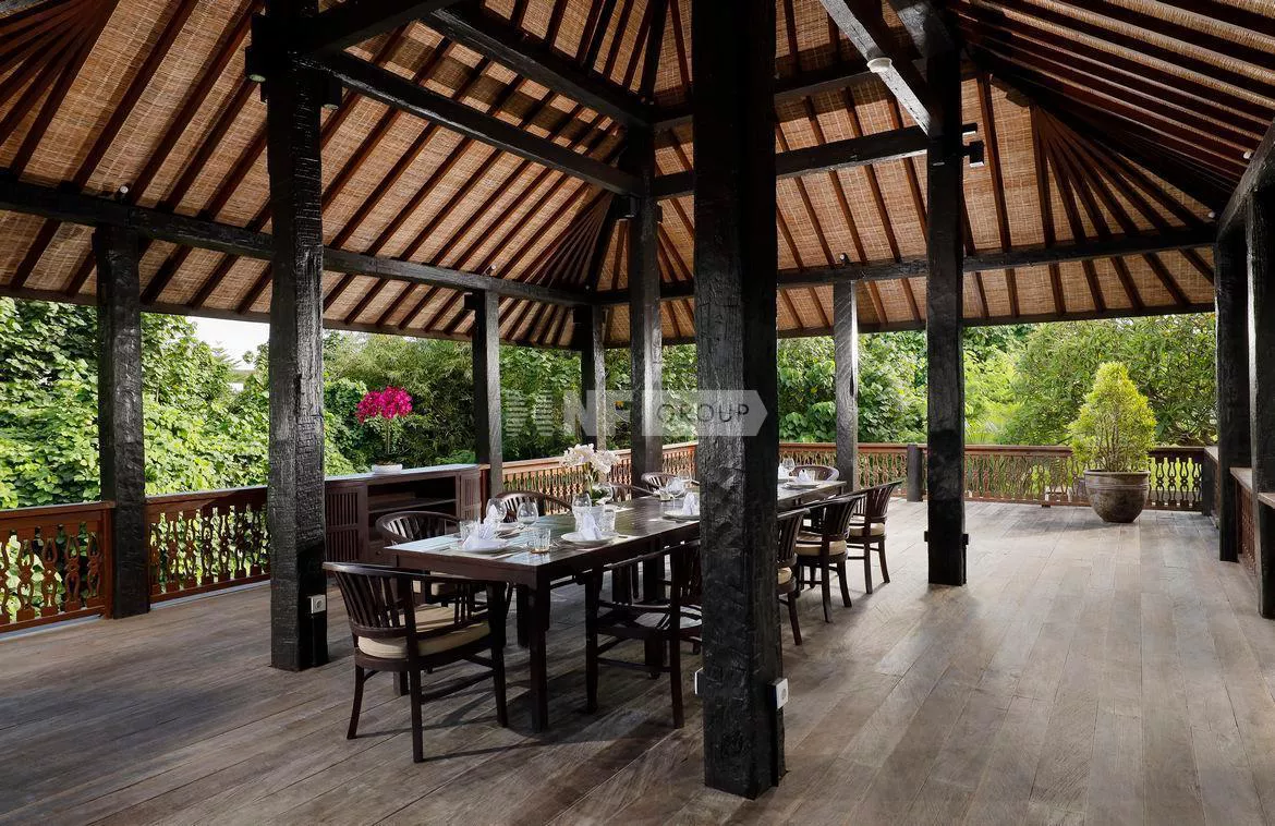 This lavish 6-bedroom abode, boasts two separate structures. The initial edifice houses four expansive bedrooms, while the second structure accommodates an additional pair. Each bedroom boasts its own cozy seating area, ensuring ample space and privacy, accompanied by a kitchenette and breakfast bar. Lush landscaping enhances the tranquil ambiance surrounding the inviting swimming pool and grand Joglo pavilion.