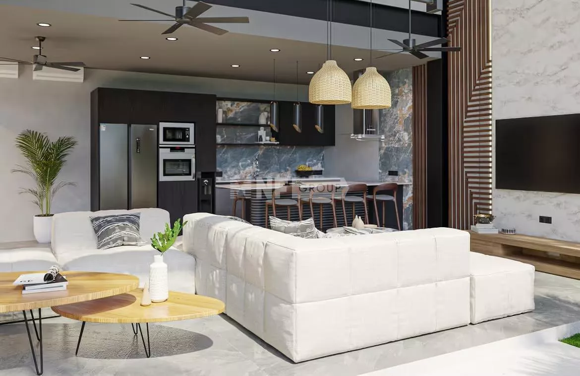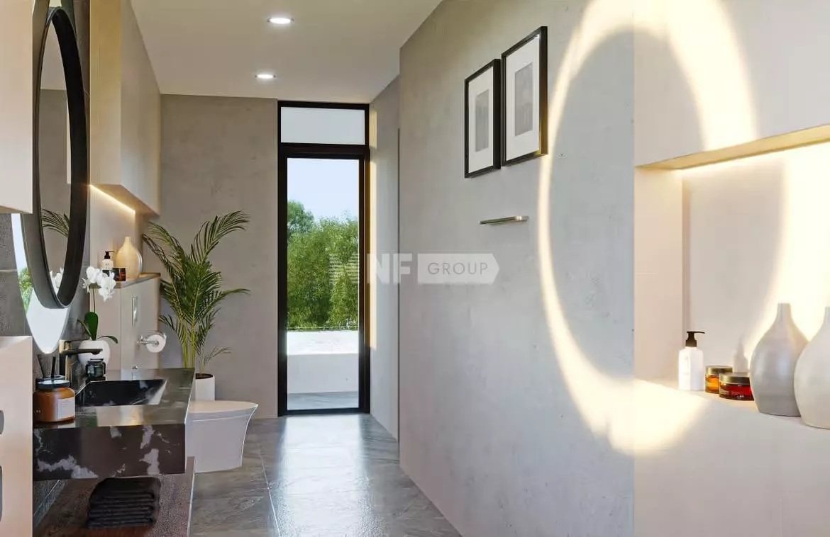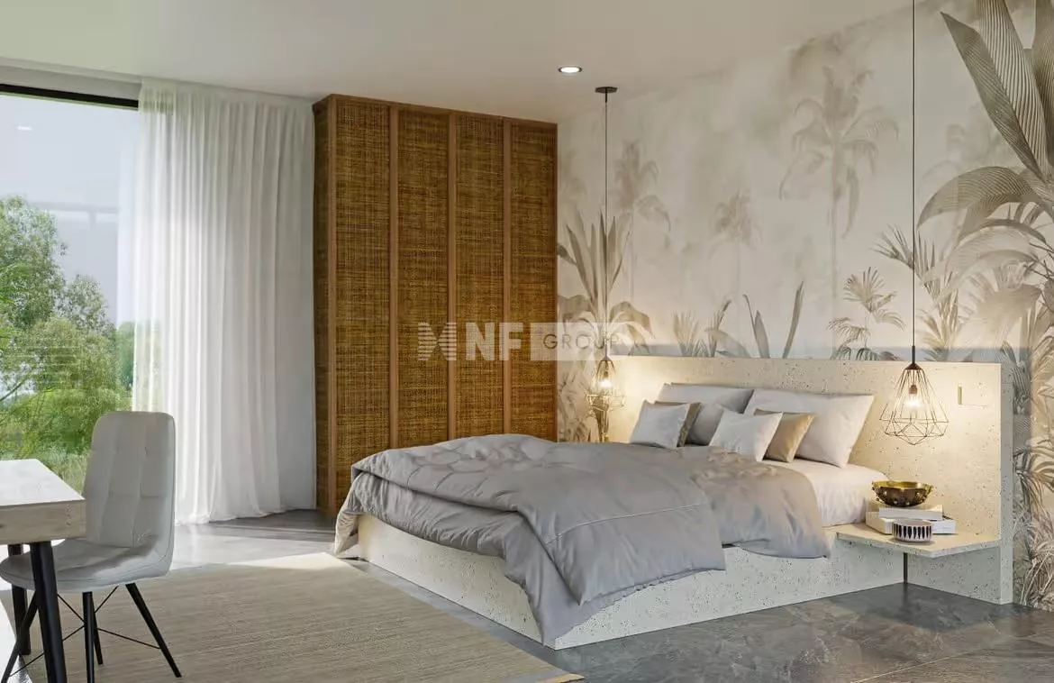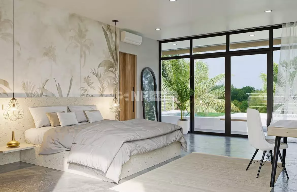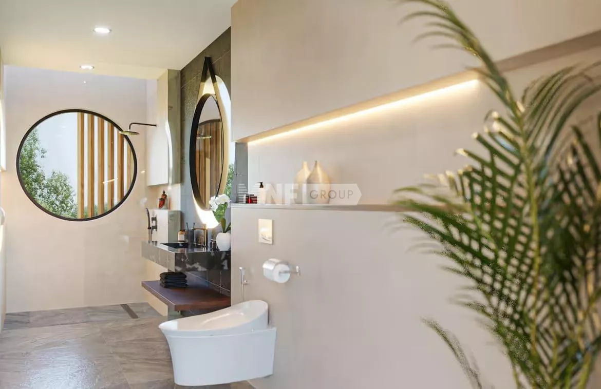 Upon entering the ground floor, one is greeted by a lofty living area with soaring ceilings, complemented by a modern, fully-equipped kitchen and a chic dining space. Here, a 9x3m swimming pool beckons, encircled by a sundeck and a cozy lounge area, perfect for unwinding. The master bedroom, with direct access to the pool, features a dedicated workspace, enhancing productivity while indulging in serenity. Ascend to the first level to discover two additional bedrooms, each with en-suite facilities and panoramic views of the natural surroundings. The piece de resistance awaits atop the villa – the top-floor master bedroom, a sanctuary of relaxation and awe-inspiring vistas. Spaciously appointed, it boasts a lavish en-suite bathroom adorned with a skylight, allowing natural light to cascade in abundantly. Slide open the doors to reveal a private roof terrace, where a luxurious Jacuzzi invites indulgence amidst panoramic splendor. An inviting U-shaped seating area sets the stage for unforgettable sunset experiences, where one can savor favorite beverages while witnessing the sky ablaze with vibrant hues as the sun gracefully sets.
