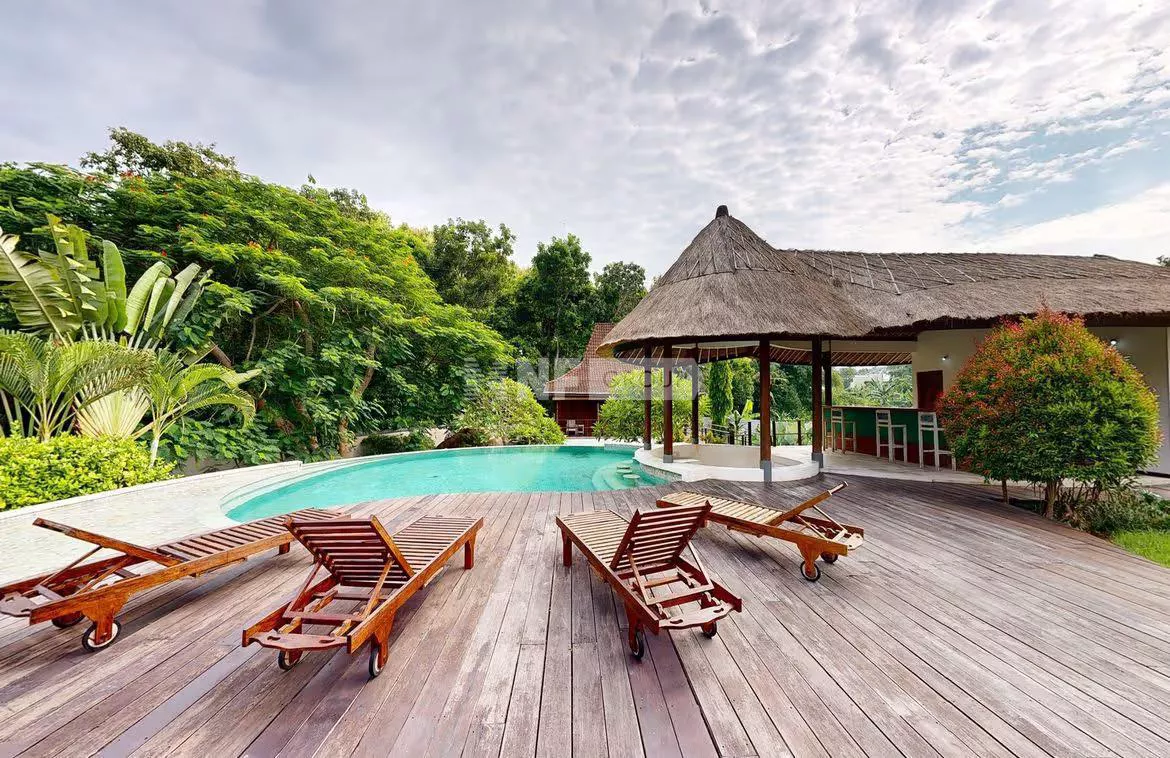 The 50 sqm swimming pool is surrounded by a wooden deck with sunbeds, offering a tranquil spot to sunbathe and enjoy the mature green surroundings. Adjacent to the pool, a pool bar connects to an open dining area, enhancing the outdoor living experience.