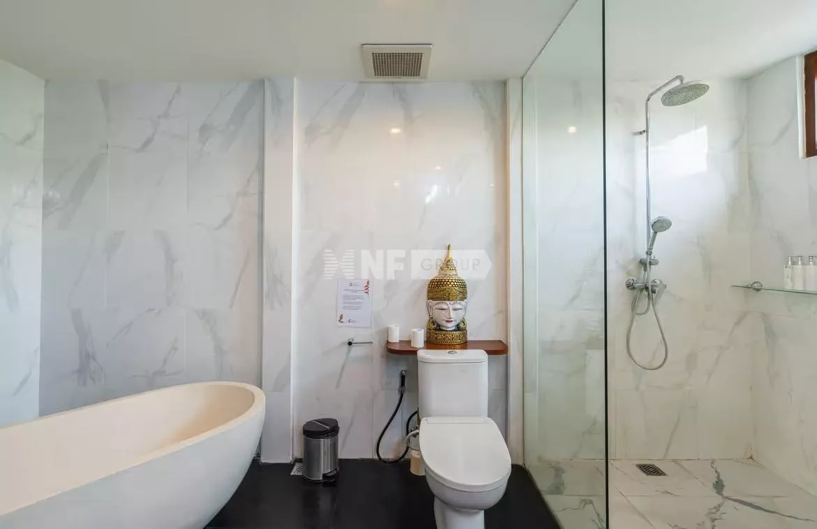 The master bedroom, adjacent to the pool, features an en-suite bathroom with an outdoor bathtub and shower, offering a private haven for unwinding. A second outdoor dining area with a bar overlooks one end of the pool, perfect for entertaining guests.