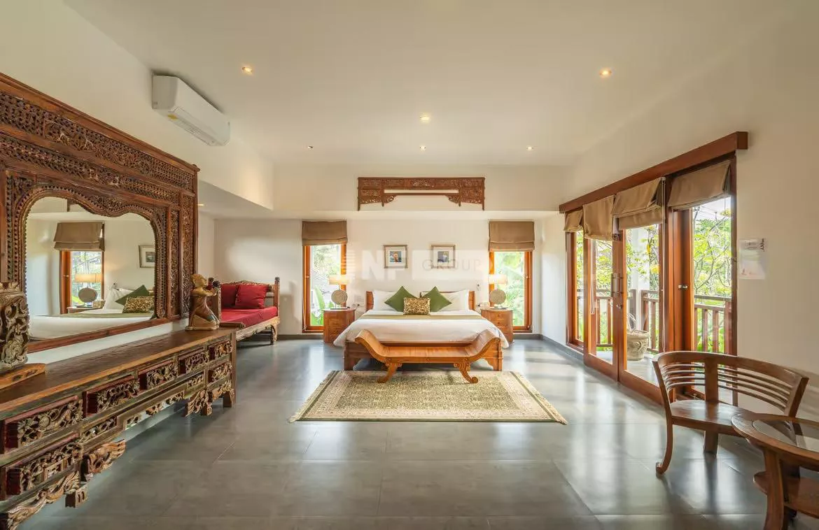 Step into a fully furnished oasis where the indoor living and dining areas seamlessly flow towards a generous 4mx15m pool enveloped by lush greenery, creating an ambiance of serene relaxation. High ceilings bathe the interiors in natural light, enhancing the spacious feel throughout.