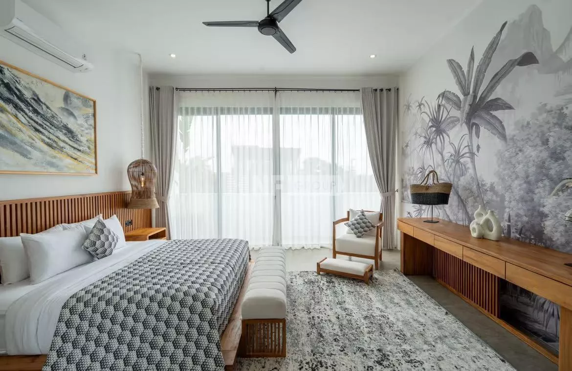 The villa offers three beautifully designed en-suite bedrooms, each thoughtfully furnished. The master suite stands out with floor-to-ceiling glass doors that open onto a balcony, allowing an abundance of natural light to flow in. The master bathroom is elegantly designed and includes a bathtub, perfect for a spa-like retreat.