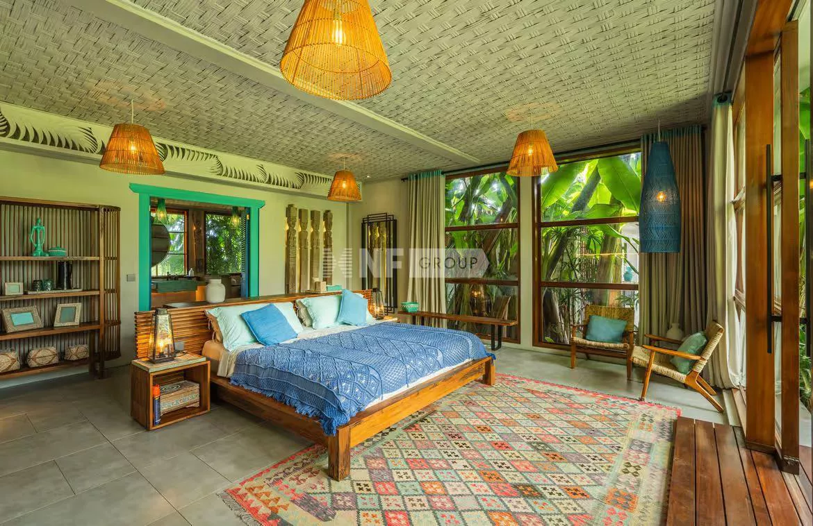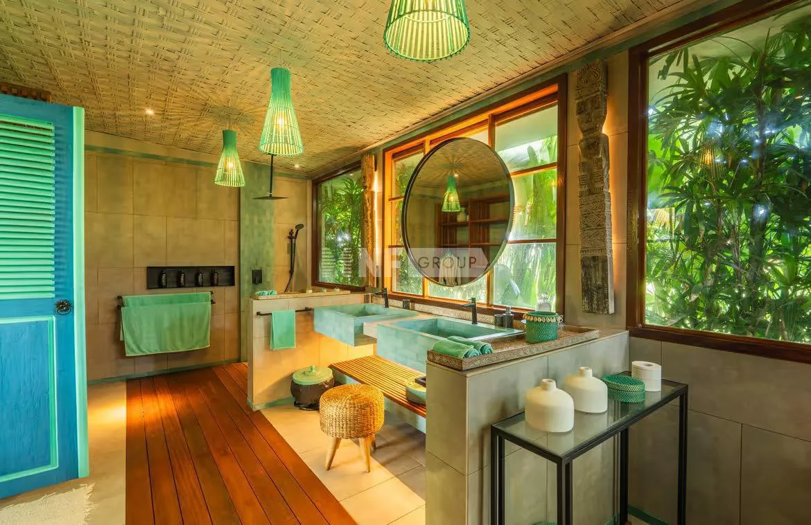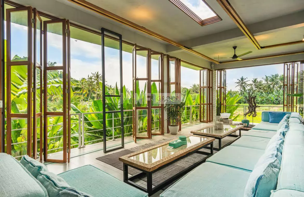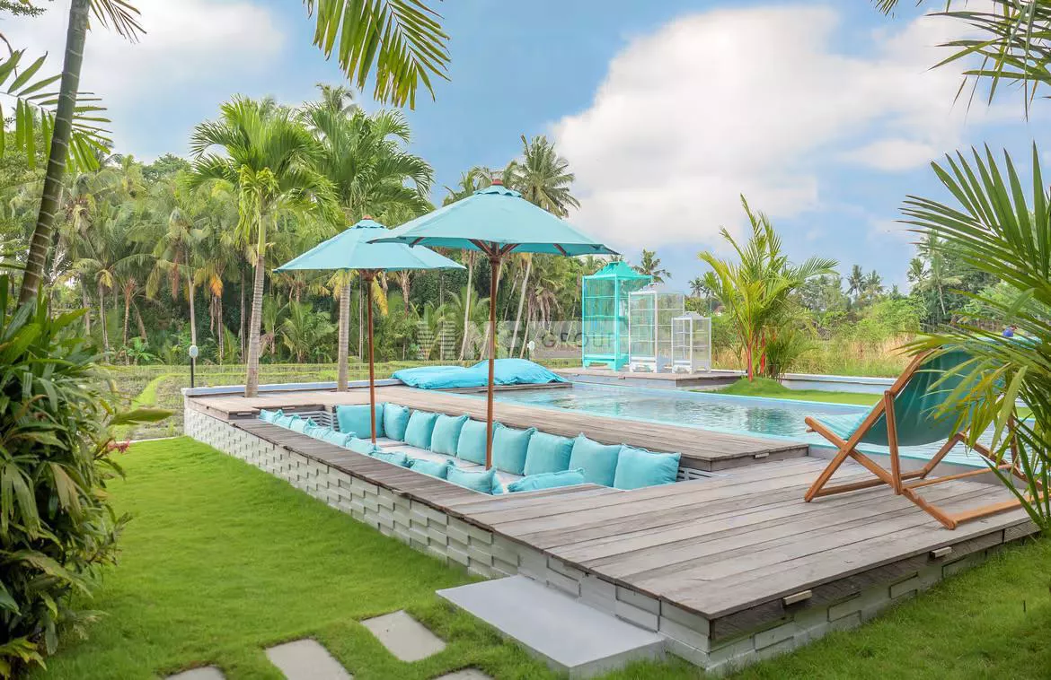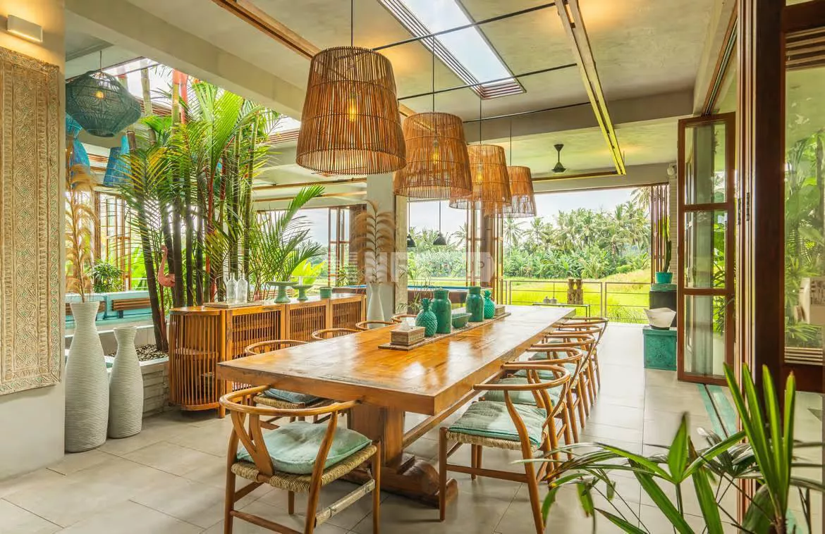This innovative modern contemporary style residence sits on 1,640sqm lease land with around 6.3 are rice field lease land adjacent. The estate comes with five spacious bedrooms, all en-suite, an open planned living and dining spaces to seat 12, a Western equipped gourmet kitchen and maid's accommodation with separate entrance. Additional facilities are a fitness room, a massage room, laundry room and an office. Outdoor is a landscaped gardens with exotic palms and Japanese grasses and 17m swimming pool with waterfall feature. This residence can accommodate big family and great to entertain friend.