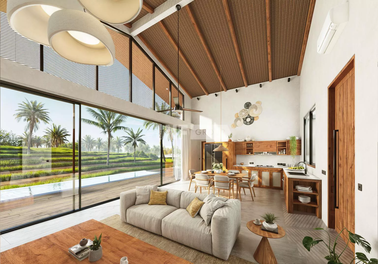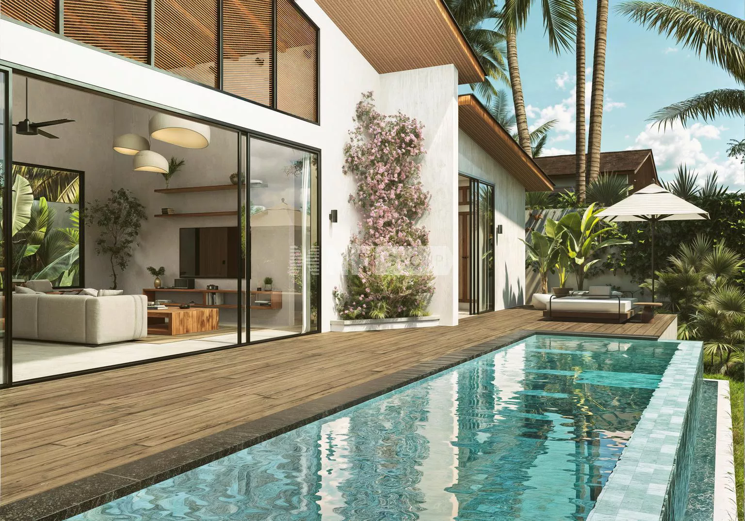 Built with a contemporary tropical design, the villa features bright open spaces, natural materials, and seamless indoor–outdoor living. The spacious living and dining area opens directly onto a beautifully landscaped garden and a private swimming pool, creating an ideal setting for relaxation and entertaining.