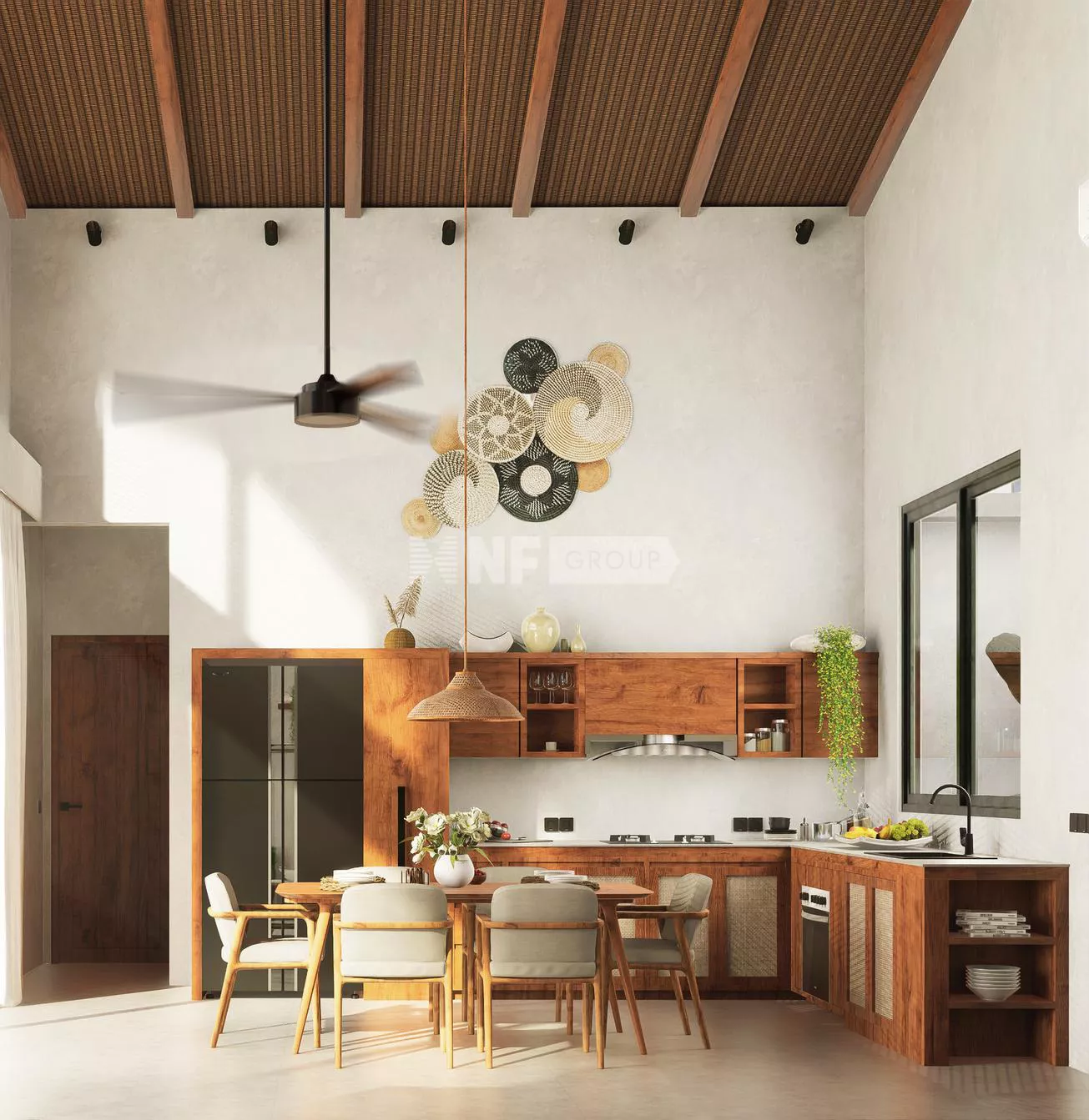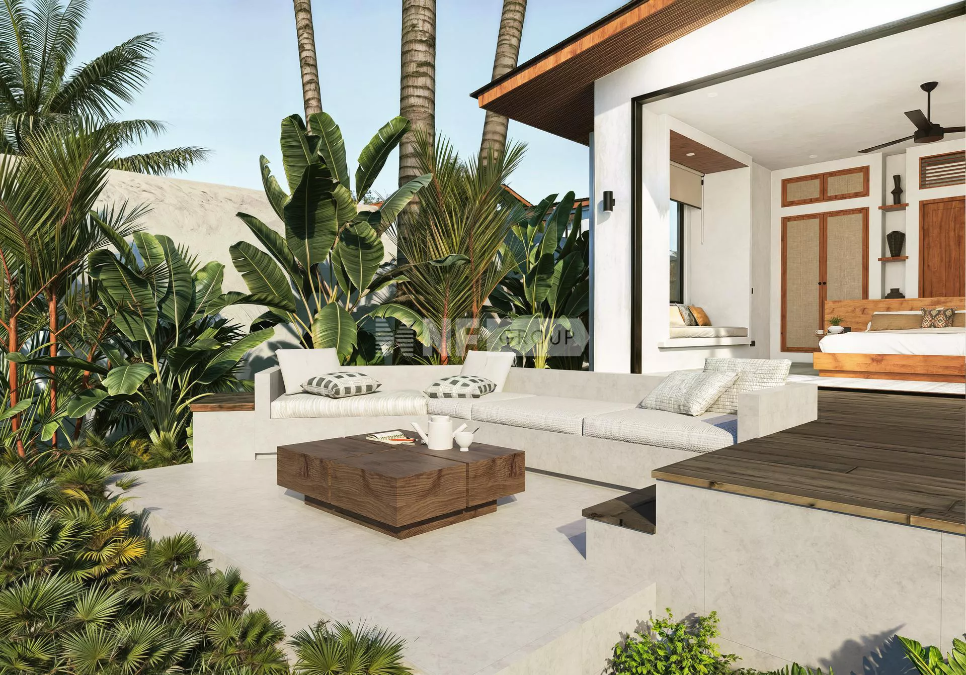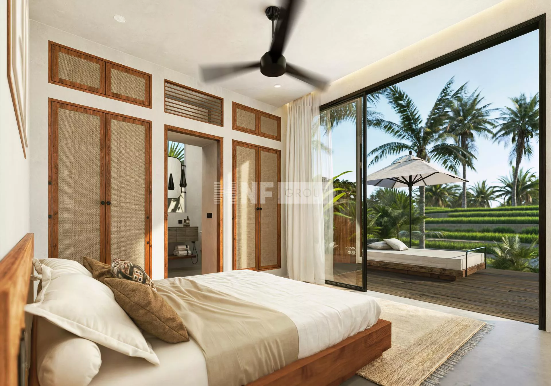 The villa includes three generously sized en-suite bedrooms, each thoughtfully designed with warm wood accents, large windows, and garden or pool views. The master suite comes with a walk-in wardrobe and a luxurious bathroom with a soaking tub and rain shower.